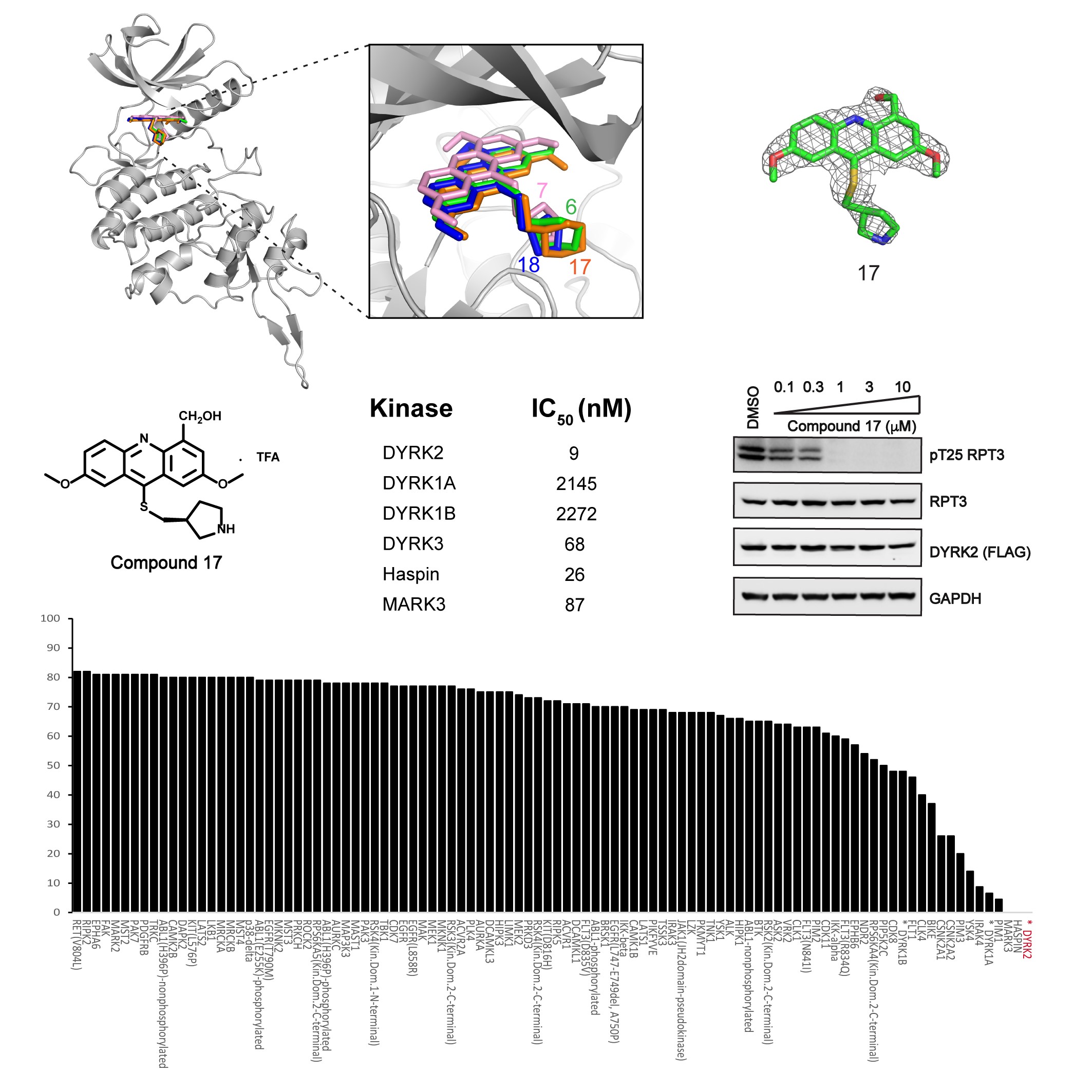 为了消除脱靶激酶的影响,该工作通过基于结构的药物设计,在基于吖啶的核心结构基础上设计、合成和评估了一系列新型吖啶类似物,并解析了11个新型小分子抑制剂与DYRK2的共晶结构。其中化合物17(C17)表现突出,对DYRK2具有纳摩级别的半抑制浓度(IC50),并对其他468个人体激酶没有明显的活性。此外,C17还有效的抑制了细胞中DYRK2的活性。因此,C17是一种高效且极具选择性的DYRK2抑制剂。