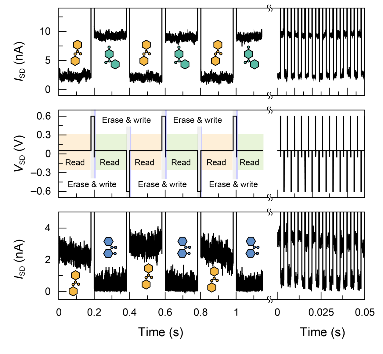 3003新葡官方网站郭雪峰课题组长期致力于单分子反应动力学机理的研究,与合作者一起揭示被系综平均掩盖的新机理和新现象,展示了基于单分子器件的平台在单分子反应动力学和单分子生物物理等基础研究方面的广阔应用前景。最近,他们以Fries重排作为模型反应,以单分子视角实时监测Fries重排的反应路径。在之前课题组直接观测分子间相互作用的基础上(Chem 2022, 8, 243; JACS Au 2021, 1, 2271; Sci. Adv. 2021, 7,eabe4365; Matter 2021, 4, 1 2874),直观地区分分子内与分子间的相互作用模式,阐明了长期具有争议的反应机制,为未来的分子相互作用研究提供了有力的工具。此外,研究发现外加偏压提供的电场可以有效地调节反应的能垒,这是在碳基单分子器件中继电场对反应过渡态正交(Sci. Adv. 2021, 7, eabf0689)或平行(J. Am. Chem. Soc. 2022, 144, 3146.)于反应坐标调控之后,对反应底物/产物分布进行精准调控的又一新的进展。依据此,他们实现了不同状态(结构)之间的有效切换,满足制备忆阻器的条件(图2)。