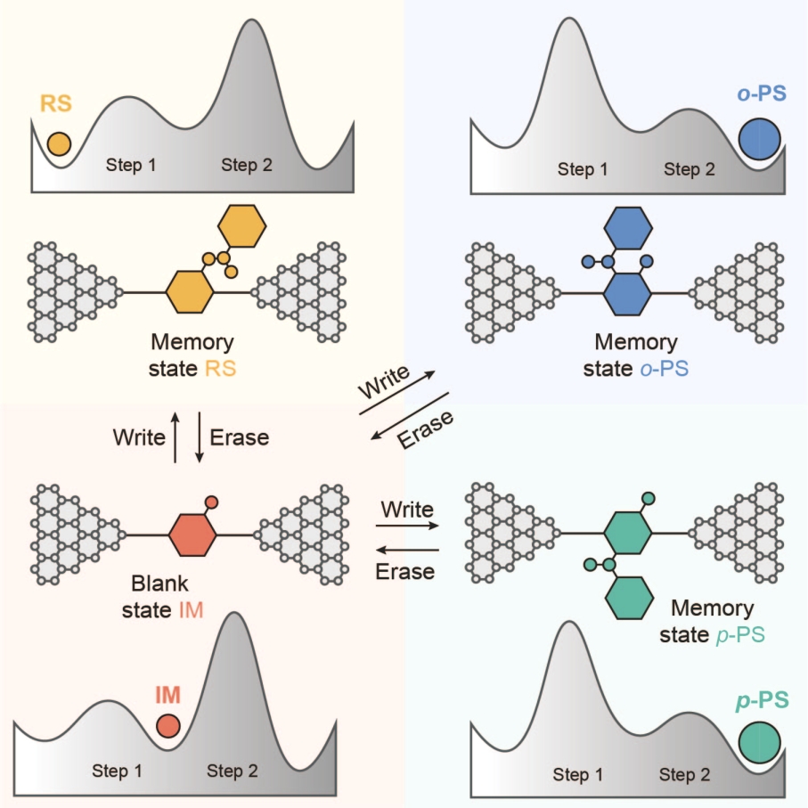 忆阻器被认为是一项有望延续摩尔定律的技术:两端结构中自触发固有电阻变化的特性使得忆阻器能够以更高的密度和更低的制造成本集成化,满足器件微小化,以及超级计算和非传统的类脑计算的需求。然而,现在忆阻器仍处于早期的发展阶段。为了进一步优化包括特征尺寸、记忆状态的持久性、写入擦除的耐受性、工作频率和开/关比等技术指标,近日,3003新葡官方网站郭雪峰课题组和刘志荣课题组合作发展了一种基于单个分子动态结构重构的记忆效应的新方法(图1)。有别于传统的电化学掺杂或电荷捕获机制,其原理是利用不同分子结构之间相对较高的能垒提供了稳定的记忆状态。此外,由于分子结构与其电导之间密切的构效关系,可以通过有机合成中的分子工程精确设计所需的电阻,以实现可调开/关比的多能级行为。单分子构建的忆阻器具有很大的潜力,其具备物理尺寸小、性能高、集成能力强等优点。