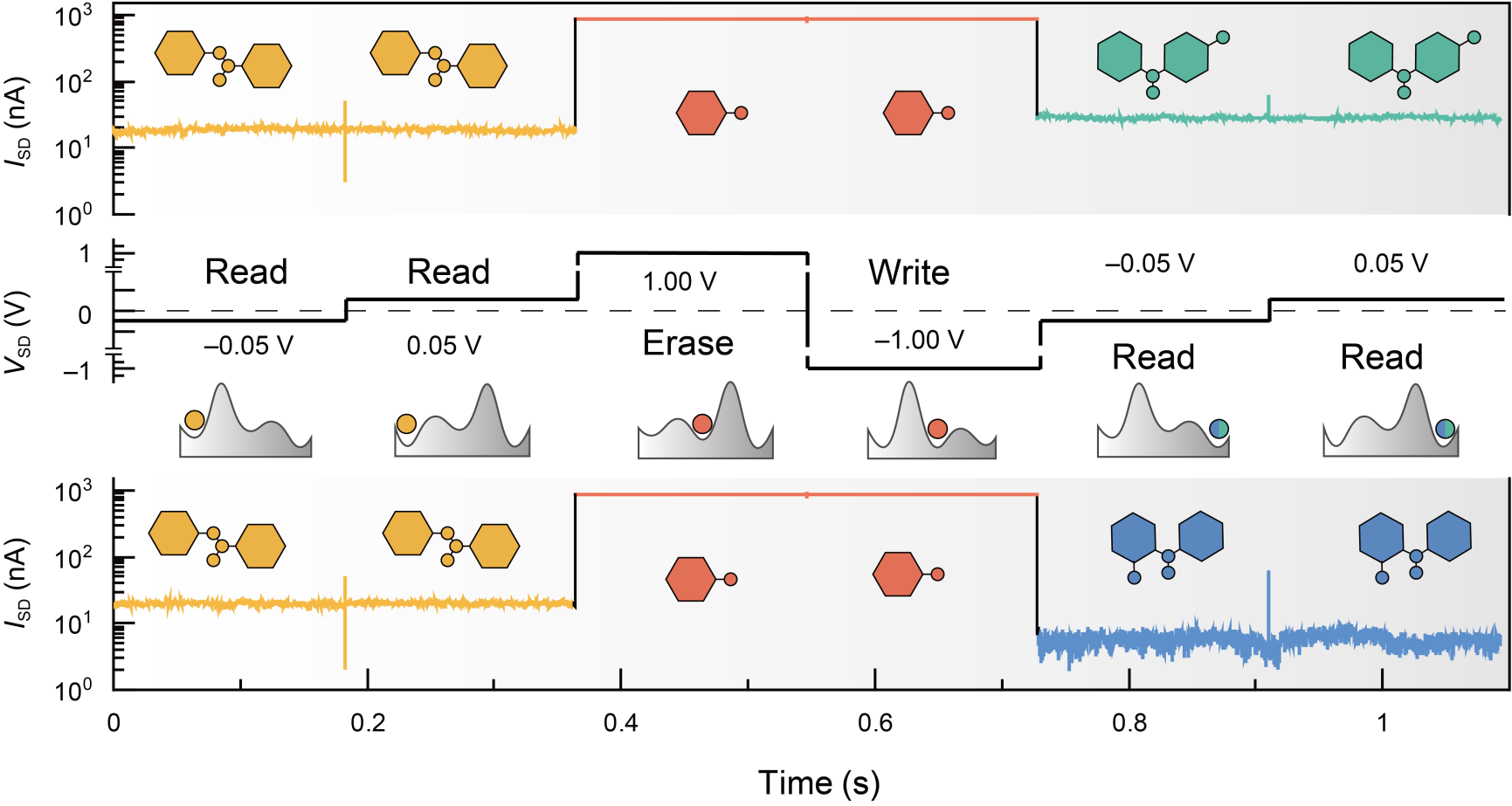 图1 基于电场驱动的动态结构重构的单分子忆阻器示意图