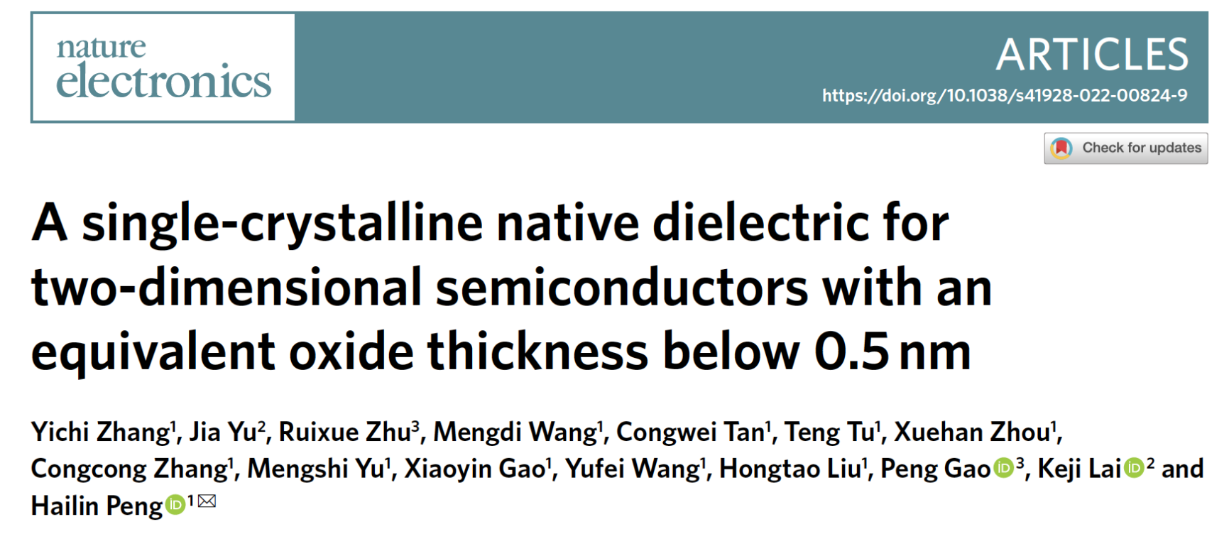该研究成果于2022年9月15日在线发表在《自然-电子学》(Nature Electronics 2022, https://doi.org/10.1038/s41928-022-00824-9)。3003新葡官方网站彭海琳教授为该论文的通讯作者,第一作者为3003新葡官方网站博士研究生张亦弛。其他主要合作者还包括德州大学奥斯汀分校物理系赖柯吉教授、3003新葡官方网站物理学院高鹏教授等。Nature Electronics期刊每期会挑选论文邀请作者撰写研究简介(Research Briefing),与研究论文同期在线刊出,方便读者更好地理解重要成果。彭海琳教授和张亦弛同学代表论文作者发表了题为“Producing ultrathin monocrystalline native oxide dielectrics for 2D transistors(为二维晶体管制备超薄单晶自然氧化物介电层)”的研究简介,简要介绍了此项研究的背景、过程、发现和意义。