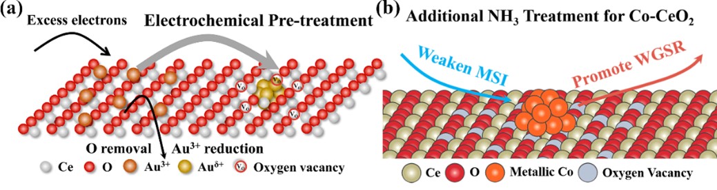 最近,张亚文课题组从CeO2基负载型催化材料出发,开发了两种精准调控界面电子结构的方法,电化学诱导界面调控策略和氨热处理界面调控策略,分别实现了增强界面电子相互作用和减弱界面电子相互作用(图1)。