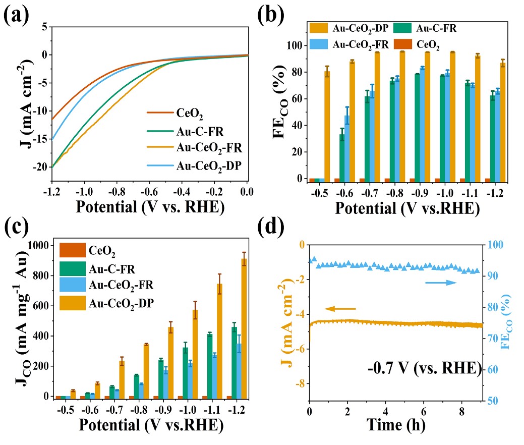 图2:Au-CeO2-DP的催化性能。(a) LSV曲线;(b) CO2电催化还原活性;(c) Au质量电流密度;(d) 催化稳定性。