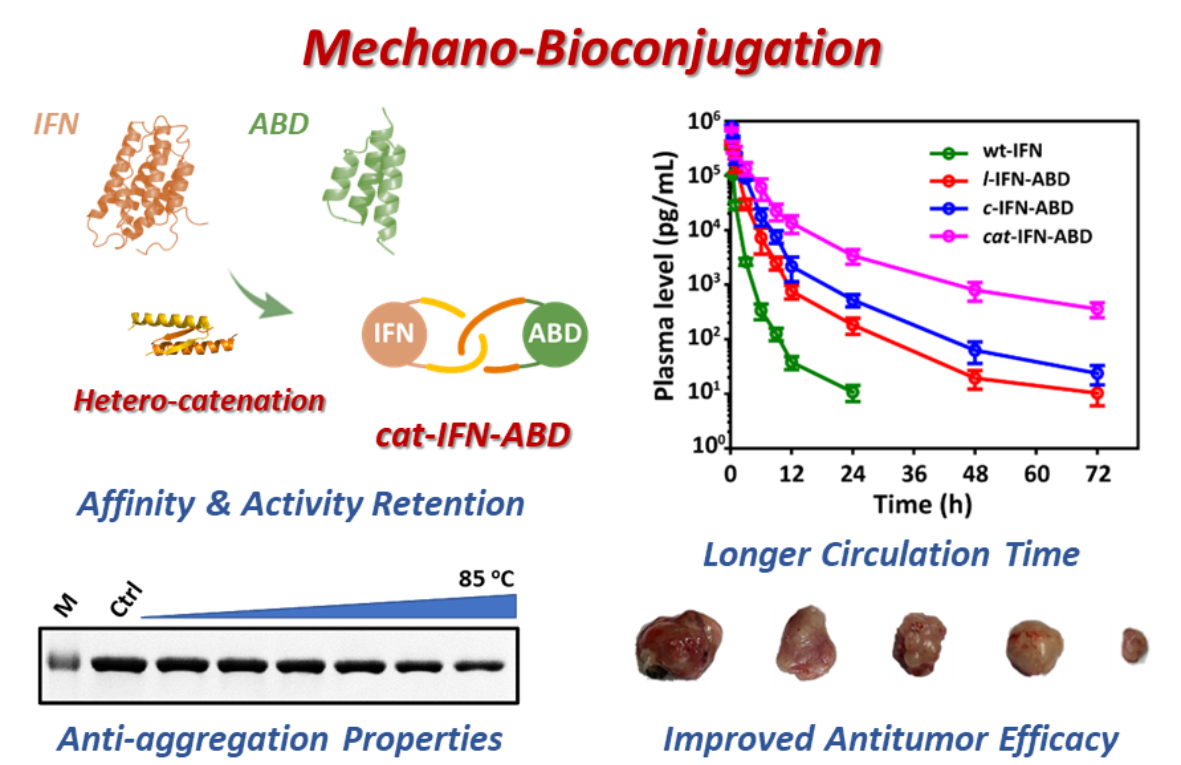 图1. 机械偶联策略有效保持了蛋白质基元对相应受体的亲和力和生物活性,可显著提高蛋白质药物的抗热聚集能力、有效延长其体内半衰期,并明显增强其体内抑瘤活性。