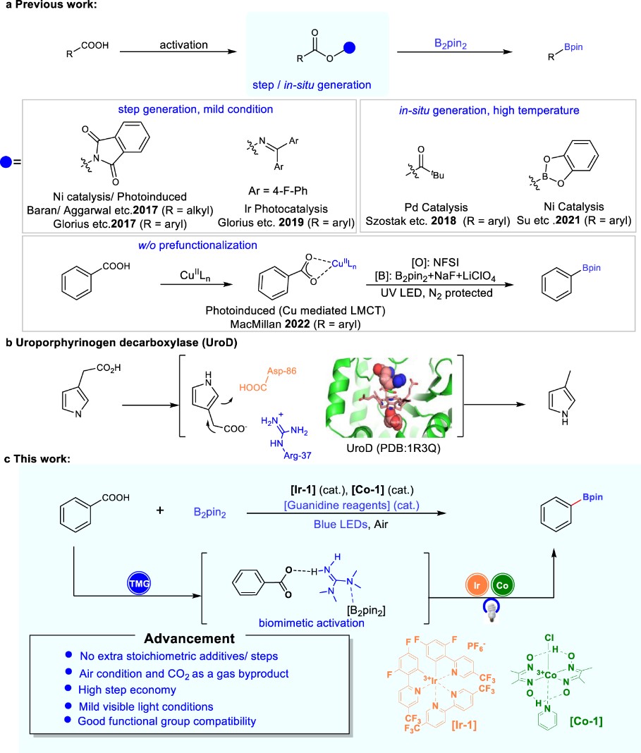 图1 可见光催化,有机胍类催化剂仿生活化的羧酸直接硼化方法学研究