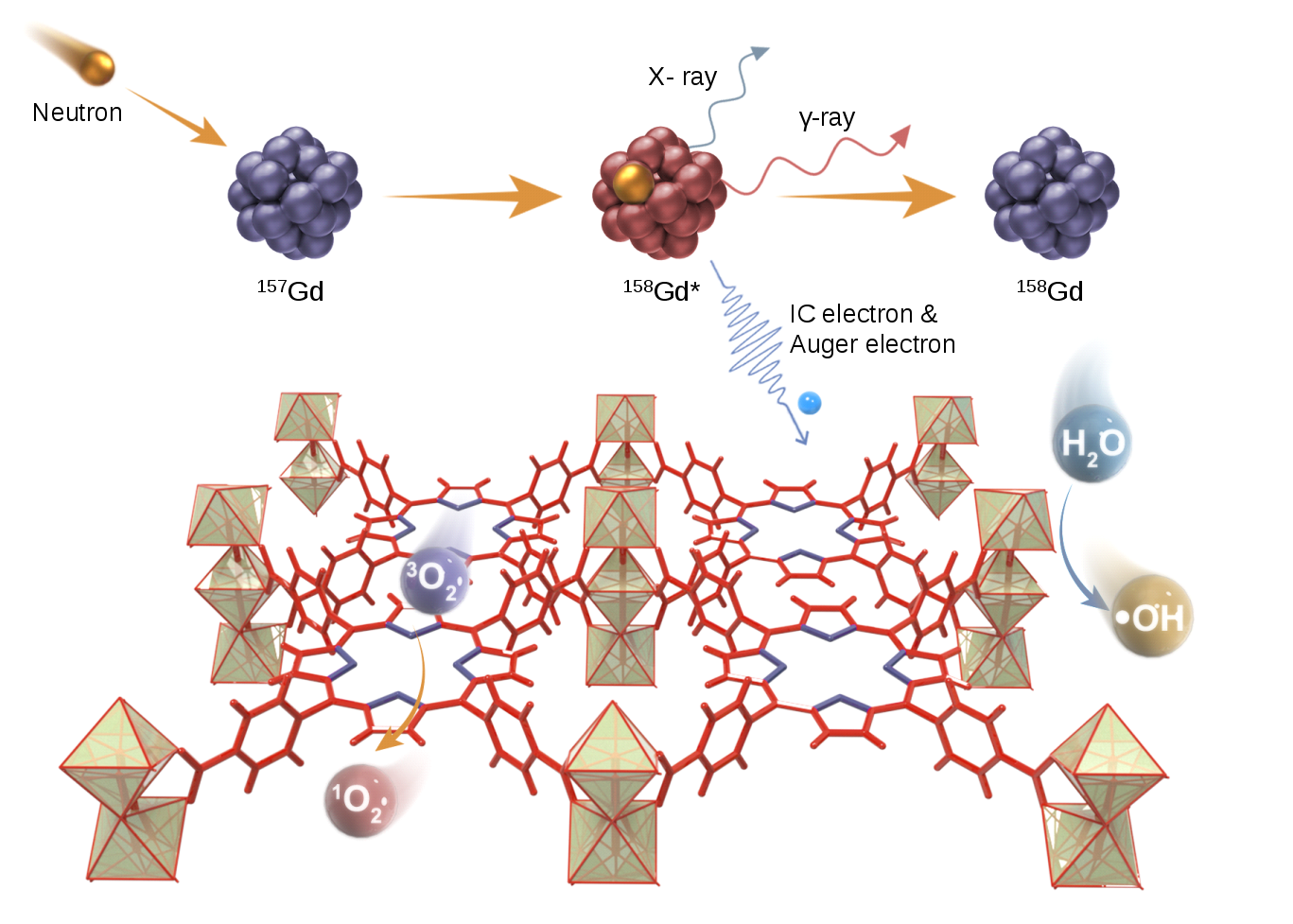 近日,北京大学3003新葡官方网站应用化学系刘志博课题组在CCS Chemistry上发表题为“Gadolinium Neutron Capture Reaction-Induced Nucleodynamic Therapy Potentiates Antitumor Immunity”的研究论文(DOI: 10.31635/ccschem.023.202202488)。该工作利用157Gd(n, γ)反应激发 MOFs材料,在肿瘤内原位产生·OH和1O2等活性氧物种,杀伤肿瘤细胞并激活全身肿瘤免疫,为中子俘获治疗和放疗增敏提供了新思路。