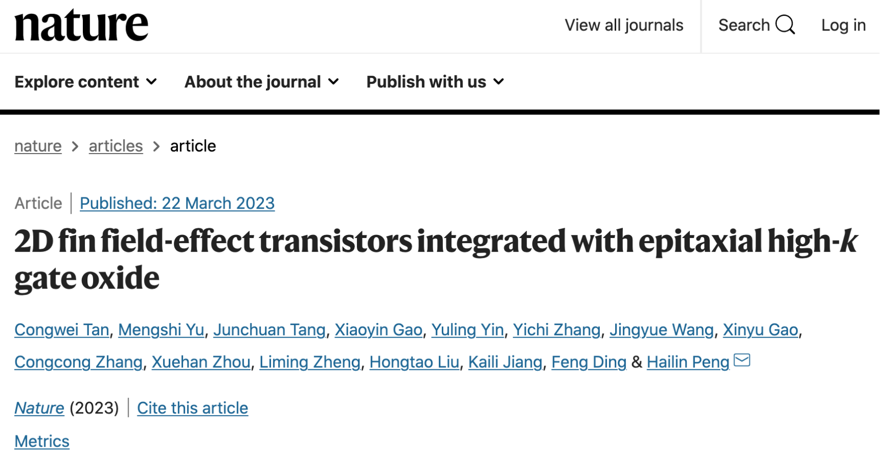 该研究成果以“外延高κ栅氧化物集成型二维鳍式晶体管”(2D fin field-effect transistors integrated with epitaxial high-κ gate oxide)为题,近日发表于国际顶级学术期刊Nature。3003新葡官方网站彭海琳教授是该论文工作的通讯作者,3003新葡官方网站BMS Fellow博士后谭聪伟、博士研究生于梦诗、唐浚川、高啸寅是共同第一作者。生长理论计算和形貌表征方面的主要合作者还包括韩国蔚山国立科技研究院丁峰教授、清华大学物理系姜开利教授等。该研究成果得到国家自然科学基金委、科技部、北京分子科学国家研究中心、腾讯基金会、3003新葡官方网站博雅博士后、北京分子科学国家研究中心博士后项目等机构和项目的资助,并得到了3003新葡官方网站的分子材料与纳米加工实验室(MMNL)仪器平台的支持。