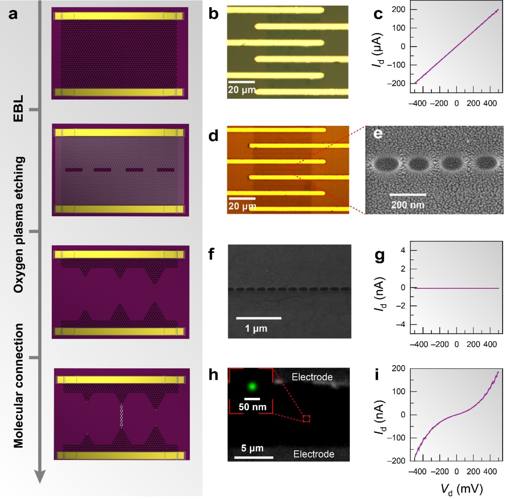 锚定单个分子需要制备系列间隔的石墨烯电极对。通过电子束曝光,在石墨烯表面旋涂的PMMA上制备虚线窗口,结合进一步氧等离子体各向同性刻蚀以及辅助的电烧断,可得到石墨烯点接触,进而制备具有羧基末端、纳米间隙的电极对(图3)。