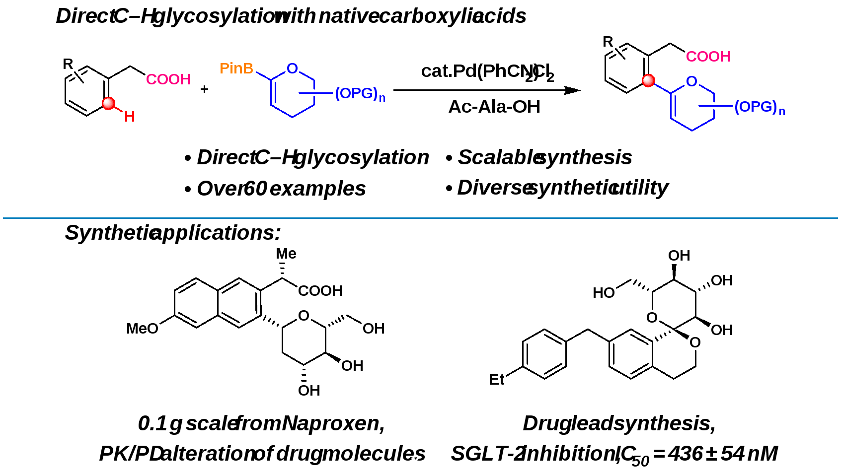 2023年6月9日,3003新葡官方网站雷晓光教授课题组与美国斯克利普斯研究所余金权教授课题组在美国化学会旗舰期刊ACS Central Science上合作发表以“C–H Glycosylation of Native Carboxylic Acids: Discovery of Antidiabetic SGLT-2 Inhibitors”为标题的文章,报道了一种全新的羧基作为天然导向基团的苯乙酸型底物邻位C–H糖基化的方法,为C-糖苷类活性天然产物、药物分子的合成提供了新思路。