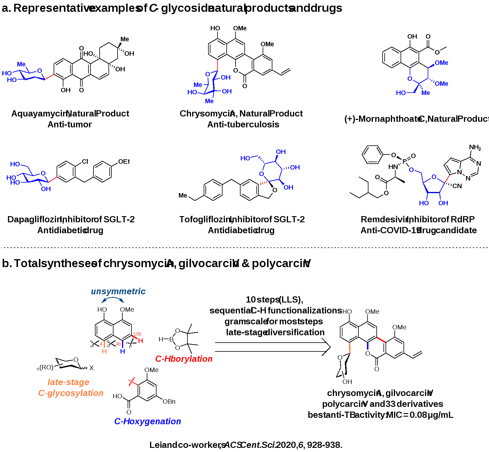 雷晓光课题组多年来持续关注着具有新颖生物活性的天然产物的高效全合成,并以全合成为基础来解决生物作用机制和天然药物开发等关键问题(Acc. Chem. Res.2020, 53, 2569)。C-芳基糖苷天然产物chrysomycin A对于多种多药耐药型结核杆菌都具有良好的抑制活性(MIC="0.4g/mL),引起了合成化学家的广泛兴趣。2020年,雷晓光课题组利用高效的连续C–H官能团化策略,首先快速构建好芳基母核,最后进行C-糖苷键的构建,仅通过10步化学转化就实现了复杂C-糖苷类天然产物chrysomycin A、polycarcin V和gilvocarcin V的克级全合成,与前人报道的18-30步的合成路线相比,其合成效率大大提高(图1b, ACS Cent. Sci.2020, 6, 928)。在探索中他们发现,在后期复杂芳基体系中进行C-糖苷键的构建是非常挑战的。高效、精确的C-糖基化方法仍需被开发出来以满足活性天然产物衍生物合成以及先导化合物的发现的需求。