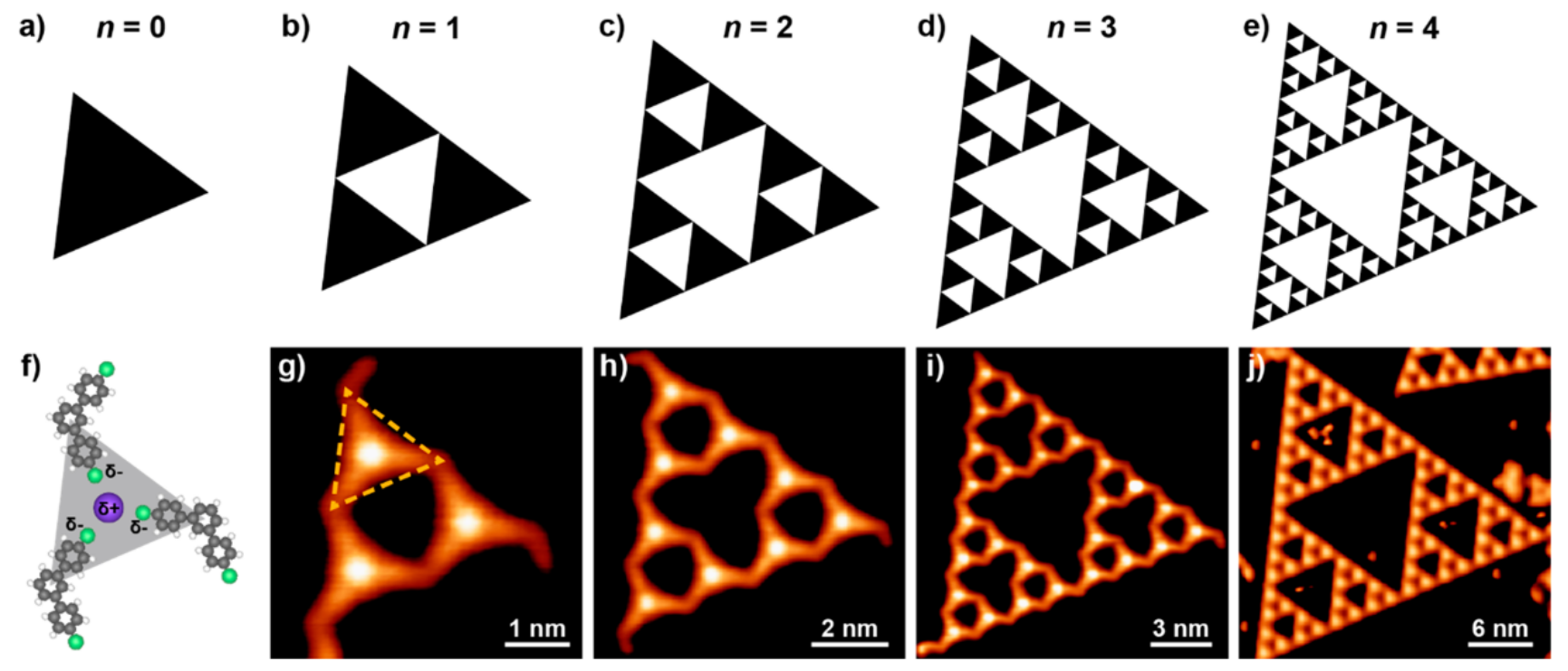 受到产物溶解性和反应可逆性等因素的限制,利用传统合成方法制备高阶、无缺陷的分子分形结构极具挑战性。吴凯教授课题组与合作者独辟蹊径,利用表面化学策略,通过单晶固体表面上的可控分子组装或反应“自下而上”地实现了一系列分子分形结构的精准构筑。2015年,他们通过精巧的前驱体设计,首次利用表面分子自组装策略成功构筑了谢尔宾斯基(Sierpiński)三角分子分形结构(Nat. Chem.2015, 7, 389-393)。研究表明,组装分子基元的120°折线型结构设计和三元环形卤键作用的形成是构筑分子分形结构的关键之所在。在此基础上,该课题组与合作者不断拓展构筑表面分子分形结构的方法,相继构筑了基于氢键(ACS Nano2015, 9, 11909)、配位作用(Chin. Chem. Lett.2015, 26, 1198;J. Am. Chem. Soc.2017, 139, 13749)以及共价键(J. Am. Chem. Soc.2019, 141, 11378)的谢尔宾斯基分子分形结构。