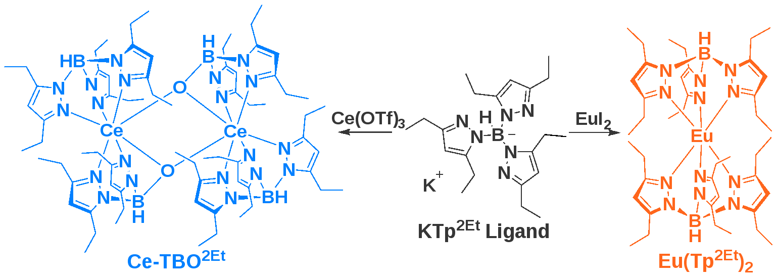 图1. 天蓝光发射的铈(III)配合物Ce-TBO2Et和橙红光发射的铕(II)配合物Eu(Tp2Et)2的合成与结构示意图。