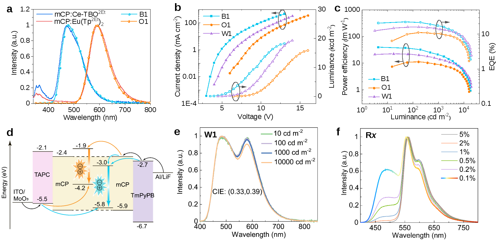 图2. 以Ce-TBO2Et和Eu(Tp2Et)2为发光材料的天蓝光OLEDs(B1)、橙红光OLEDs(O1)和SEL-WOLEDs(W1)的器件结构及性能曲线,器件Rx是以不同浓度橙红光发射的铱(III)配合物Ir(bt)2acac替代Eu(Tp2Et)2制备的参比器件。