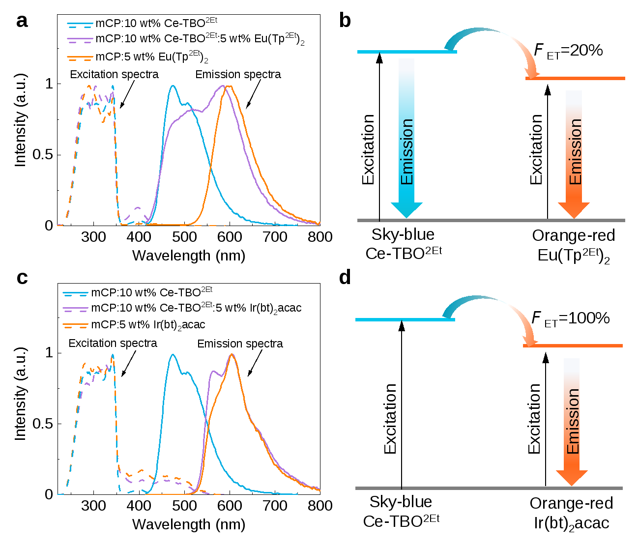 图3. 以Ce-TBO2Et、Eu(Tp2Et)2或/和Ir(bt)2acac为发光材料的掺杂薄膜的激发与发射光谱,以及双组分掺杂膜mCP:Ce-TBO2Et:Eu(Tp2Et)2和mCP:Ce-TBO2Et:Ir(bt)2acac中的传能机理与效率示意图。