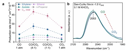 图1. (a)不同CO/CO2混合气氛下的共电催化C2+产物生成速率;(b)在相同反应条件下从CO2向CO转换过程下的原位表面增强红外吸收光谱。