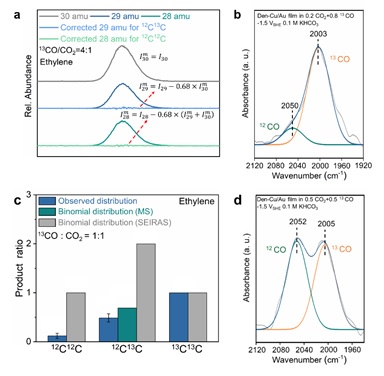 图2. (a) 13CO/12CO2混合气氛(4:1)下共电催化得的乙烯同位素分布;(b)在相同反应条件下的原位表面增强红外吸收光谱;(c)共电催化13CO/12CO2混合气氛(1:1)下观察到的乙烯同位素分布与预期的同位素二项式分布;(d)在相同反应条件下的原位表面增强红外吸收光谱。