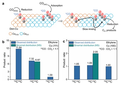 图3. (a) Cu上双位点模型示意图;共电催化13CO/12CO2混合气氛(1:1)下在(b) Cu(111)与(c) Cu(100)观察到的乙烯同位素分布与期待的同位素二项分布。