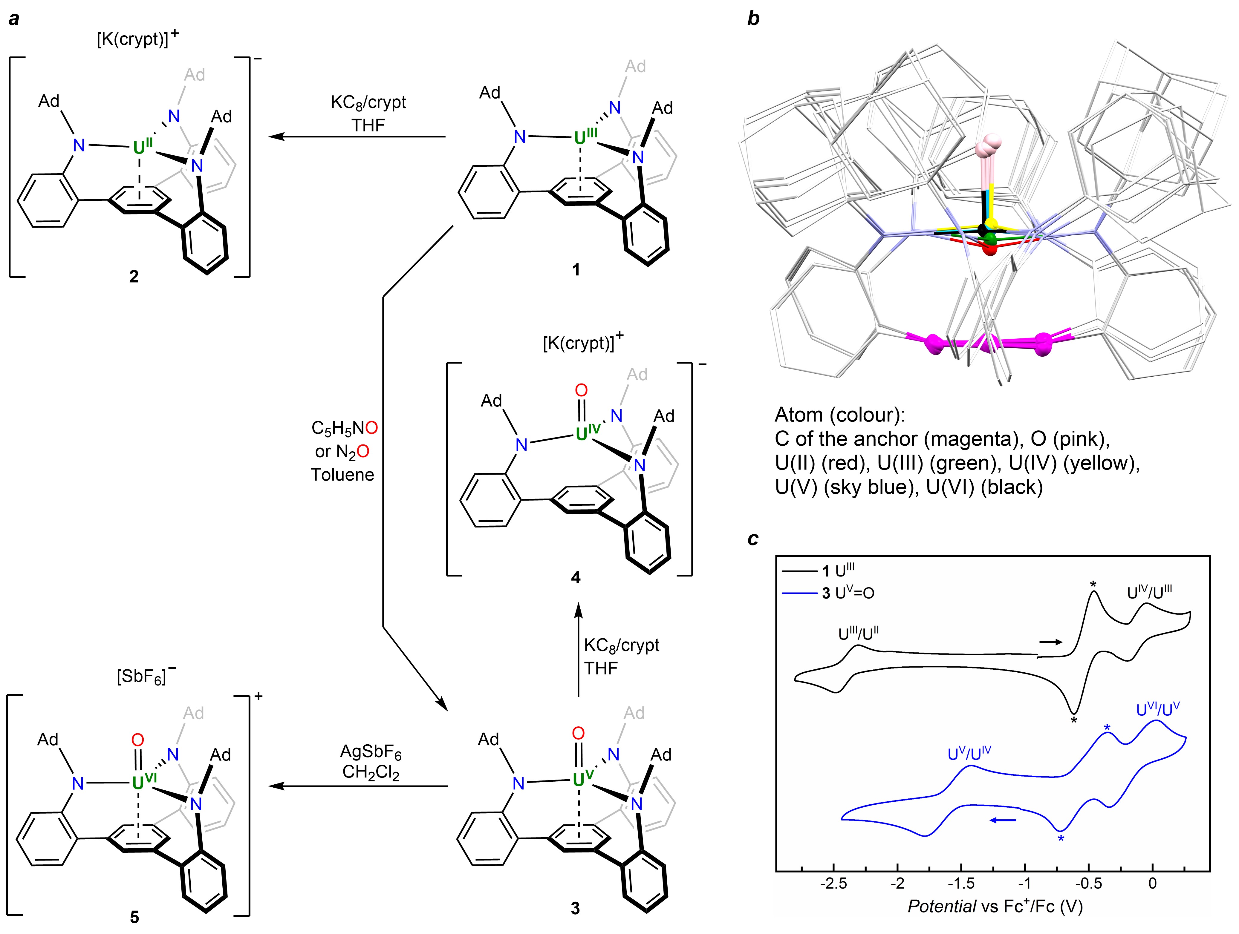 黄闻亮课题组近年来聚焦“f区金属–芳烃相互作用”这一主题,合成了一系列反三明治型f区金属芳烃配合物(图1a),并设计了一类三脚架型三胺基芳烃配体(图1b)。在该项工作中,通过引入金刚烷基(Ad)提高了所得配体[AdTPBN3]3–的刚性和结晶性,实现了对铀五种氧化态+II至+VI)的稳定(图1c)。具体来说,从配体钾盐与三碘化铀制得的铀(III)配合物1出发,利用强还原剂可得到铀(II)配合物2;另一方面,1与吡啶-N-氧化物或N2O反应能得到铀(V)的末端氧化物3。铀(V)配合物3在石墨钾或六氟锑酸银的作用下可分别被还原或氧化成铀(IV)或铀(VI)的末端氧化物4和5(图2a)。值得一提的是,这些铀配合物均具有较高的热稳定性。单晶X射线衍射显示,铀与底座芳烃的距离随氧化态的变化而变化:在铀(IV)配合物中达到峰值,随着氧化态的降低或升高,该距离逐渐缩短(图2b)。