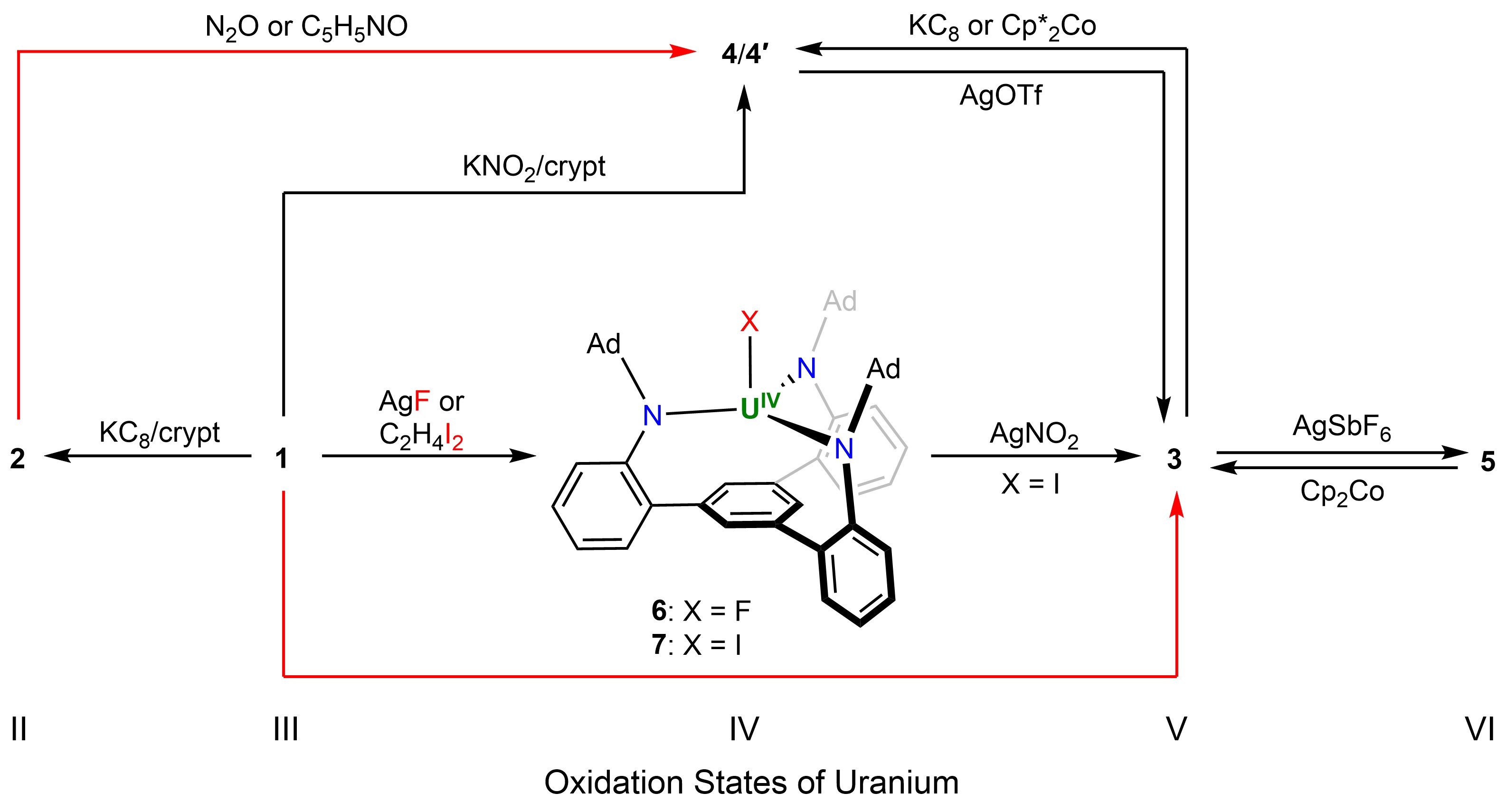 电化学测试表明,铀(III)和铀(V)配合物1和3的循环伏安曲线各显示有两组可逆的单电子氧化还原峰(图2c),提示1的单电子化学氧化是可行的。诚然,氟化银或1,2-二碘乙烷可将1直接氧化成铀(IV)卤化物6或7,而铀(IV)碘化物7可进一步与亚硝酸银反应,消除碘化银并脱去NO后得到铀(V)氧化物3。此外,1也可与亚硝酸钾发生单电子氧转移反应得到铀(IV)氧化物4。最后,铀(II)配合物2也能与氧转移试剂反应得到4,拓展了尚处于起步阶段的二价铀的多电子氧化还原化学(图3)。