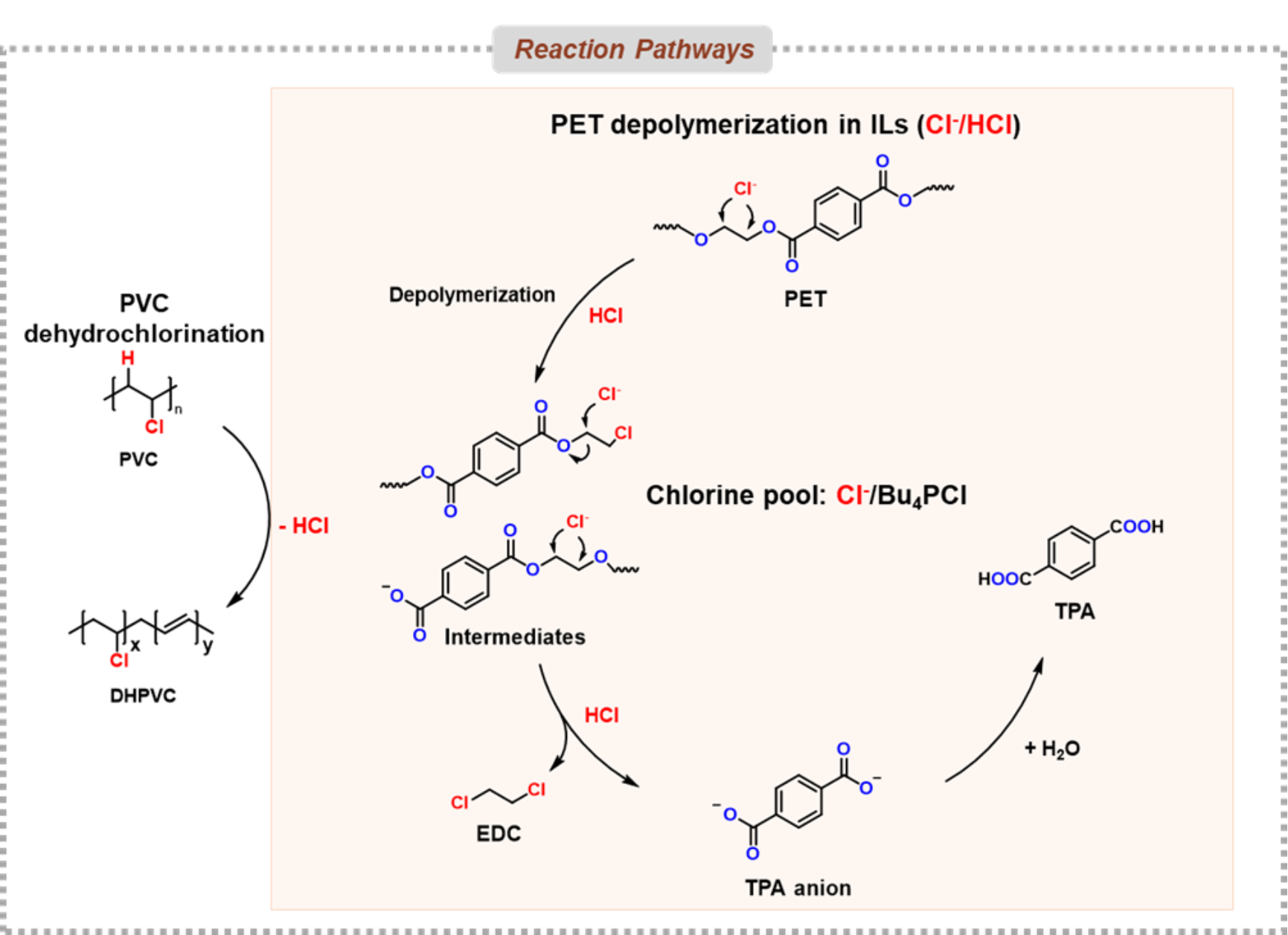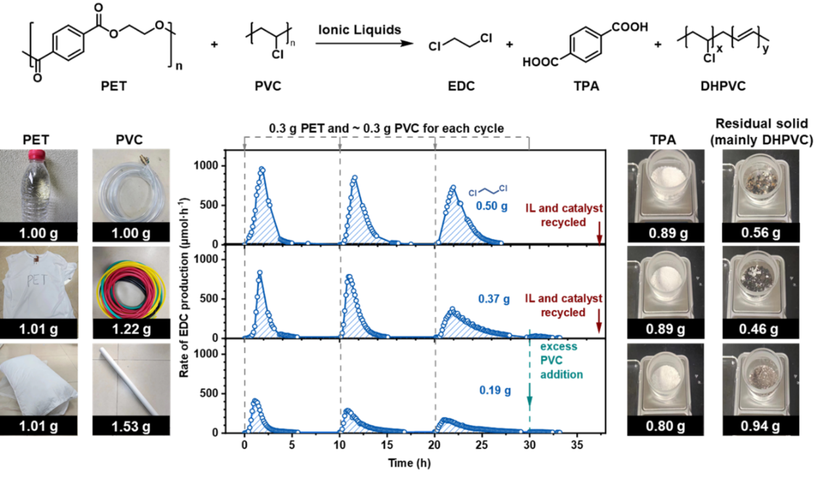 近日,3003新葡官方网站马丁/王蒙课题组报道了一种离子液体催化体系,实现了将具有类似密度的聚氯乙烯(PVC)和聚对苯二甲酸乙二醇酯(PET)混合废塑料的共同升级转化。这一工作中将PVC脱氯产生的HCl储存在离子液体中用于PET的解聚,实现了废塑料中最难以处理的氯资源的优化利用,同时以高收率制得二氯乙烷和对苯二甲酸这两种重要化工原料,反应路径如图1所示。