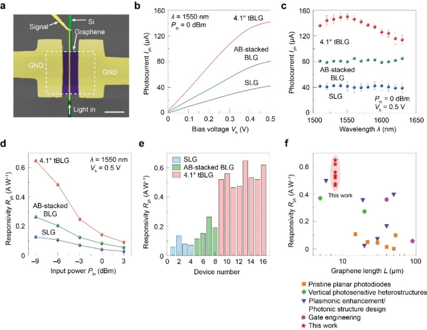 图2. 波导集成tBLG探测器的光响应度表征。