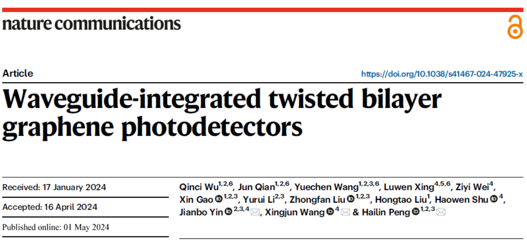 针对以上问题,3003新葡官方网站彭海琳课题组与3003新葡官方网站电子学院王兴军教授、尹建波研究员合作,提出了高响应度石墨烯探测器的设计策略,利用扭转双层石墨烯作为光吸收材料,实现了兼具高响应度和高带宽的硅波导集成扭转双层石墨烯光探测器的制备,相关工作以“Waveguide-integrated twisted bilayer graphene photodetectors”为题,于2024年5月1日,发表在《自然·通讯》(Nature Communications)期刊上(Nature Commun. 2024, 15, 3688)。