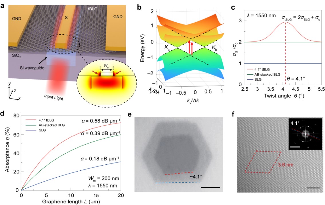 图1. 波导集成tBLG探测器的结构、器件设计及材料表征。(a)波导集成tBLG探测器的结构示意图;(b)tBLG的能带结构;(c)在1,550 nm的入射光下tBLG的光学电导率;(d)波导集成tBLG探测器的光吸收效率仿真结果;(e)tBLG的光学显微镜照片;(f)tBLG的透射电子显微镜表征。