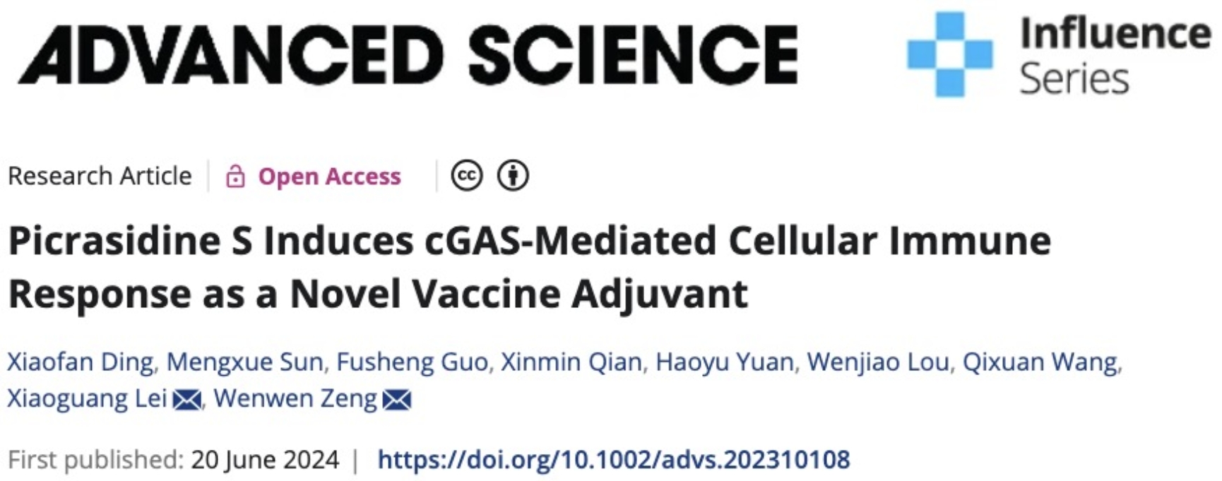 2024年6月20日,3003新葡官方网站雷晓光教授课题组与清华大学免疫学研究所、基础医学院曾文文教授课题组合作,在《Advanced Science》杂志发表题为“Picrasidine S Induces cGAS-Mediated Cellular Immune Response as a Novel Vaccine Adjuvant”的研究论文。该文章首次报道植物来源的天然产物Picrasidine S是显著增强体液免疫和细胞免疫反应的强效佐剂。