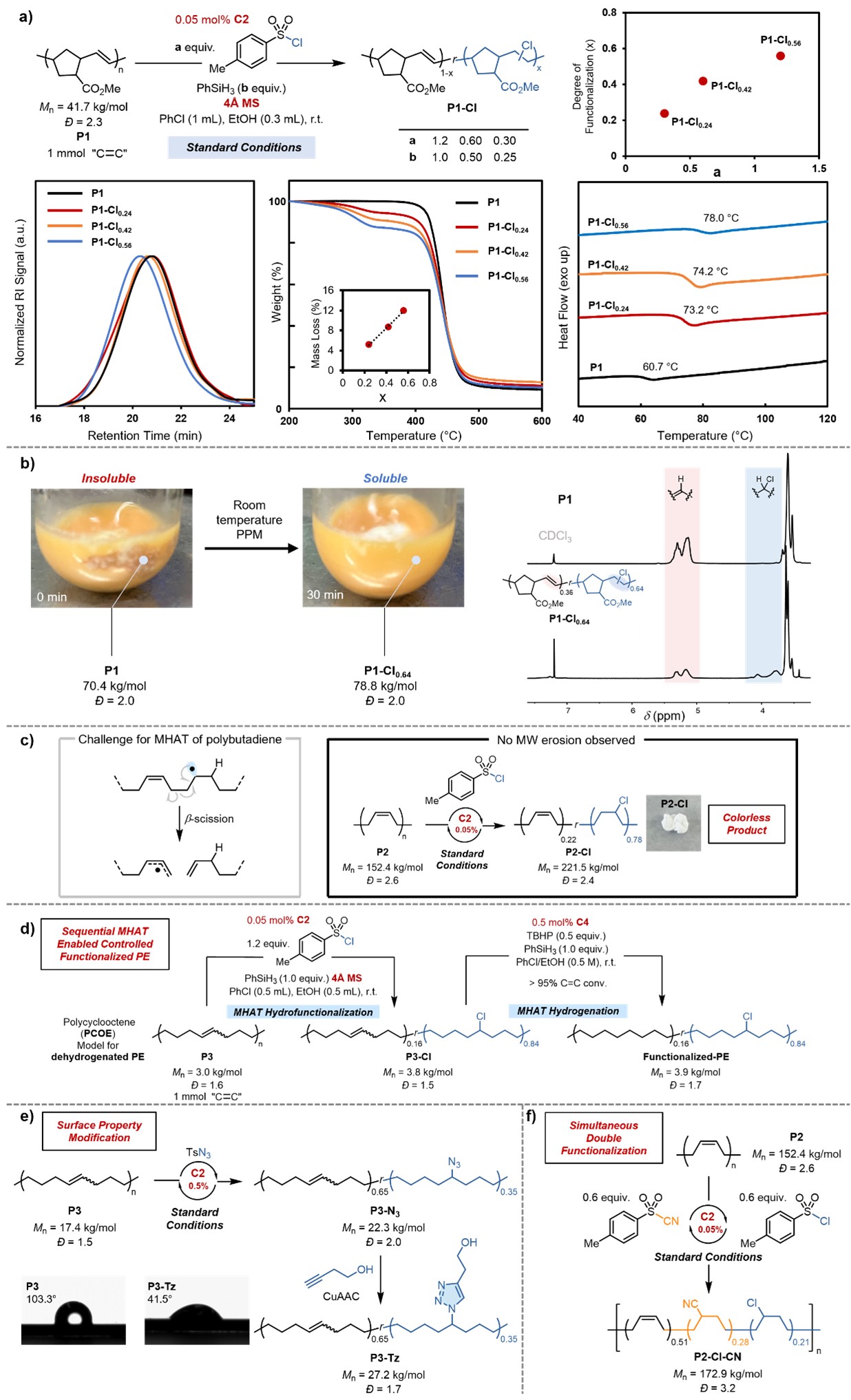 朱戎课题组基于前期的研究积累,发展了低Co催化剂载量(0.05 mol%,TON up to>3300)下的非活化内烯烃氢官能团化反应,并将其应用于高分子主链内烯烃的后修饰上。此外,该工作还揭示了烯丙位取代基的电负性和超共轭效应对MHAT区域选择性的影响。