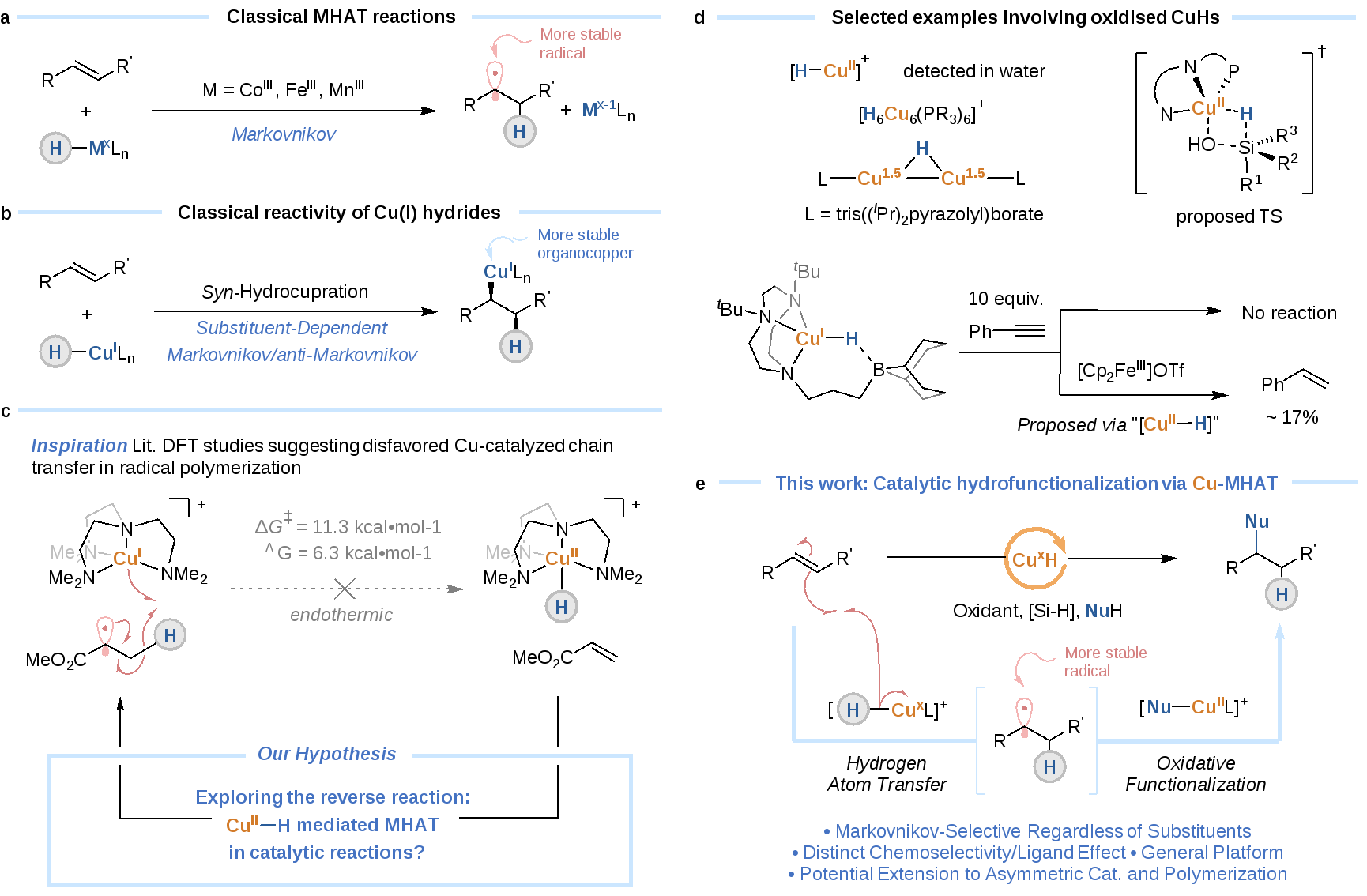 朱戎课题组受此启发提出,上述过程的逆反应恰恰对应着一种新的MHAT体系:即Cux−H(非传统价态铜氢物种,其中x可能为2)向烯烃进行氢原子转移将是动力学和热力学均十分有利的过程(Cu-MHAT,图1)。该过程生成的自由基随后被Cu(II)捕获,可实现与各类杂/碳原子亲核试剂的偶联。非传统价态铜氢物种(Cux−H)的反应显示了与传统Cu(I)−H催化截然不同的化学选择性、区域选择性、配体依赖性。