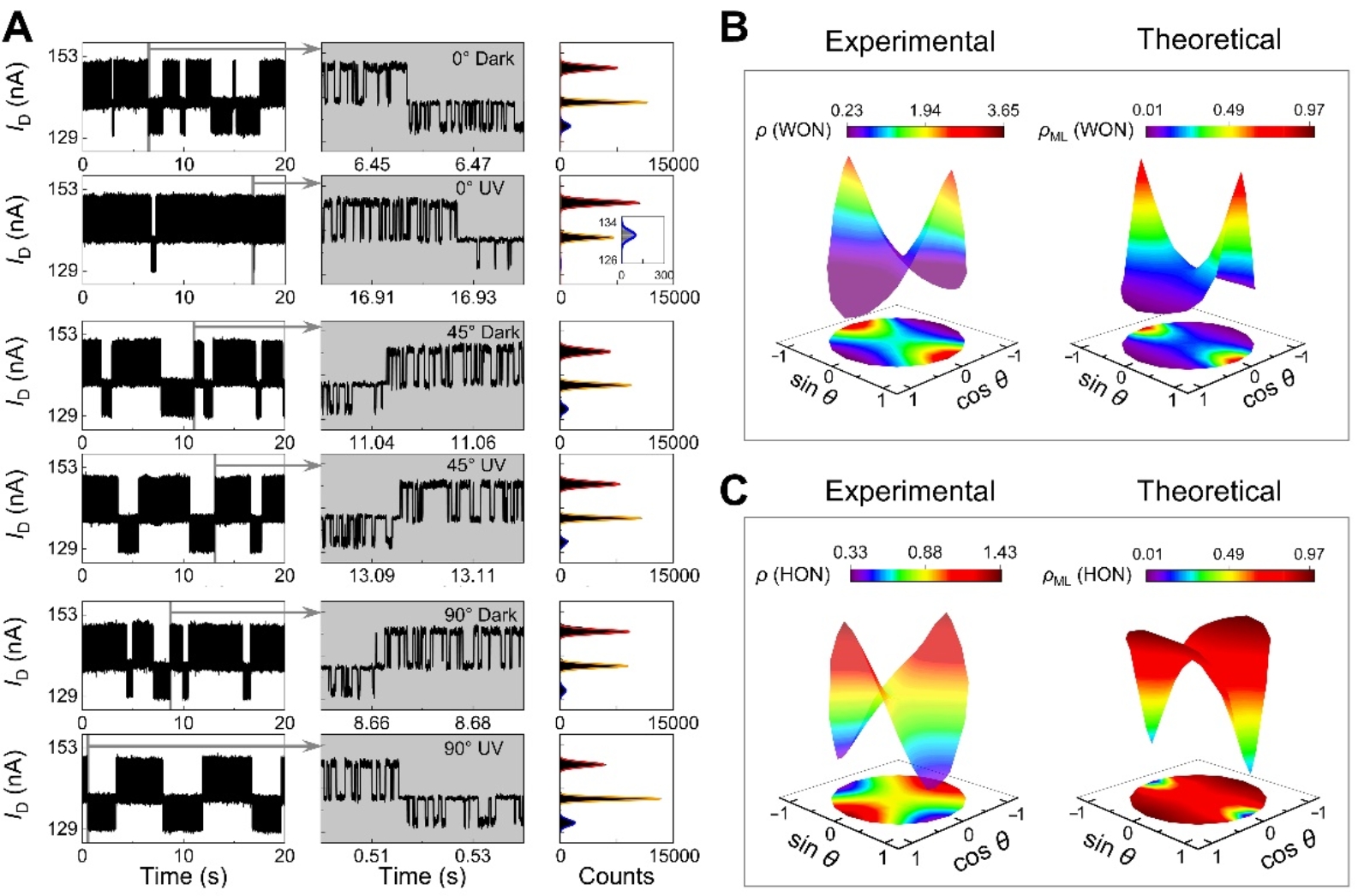 图2. 线偏振光对三级胺单分子器件的手性富集。