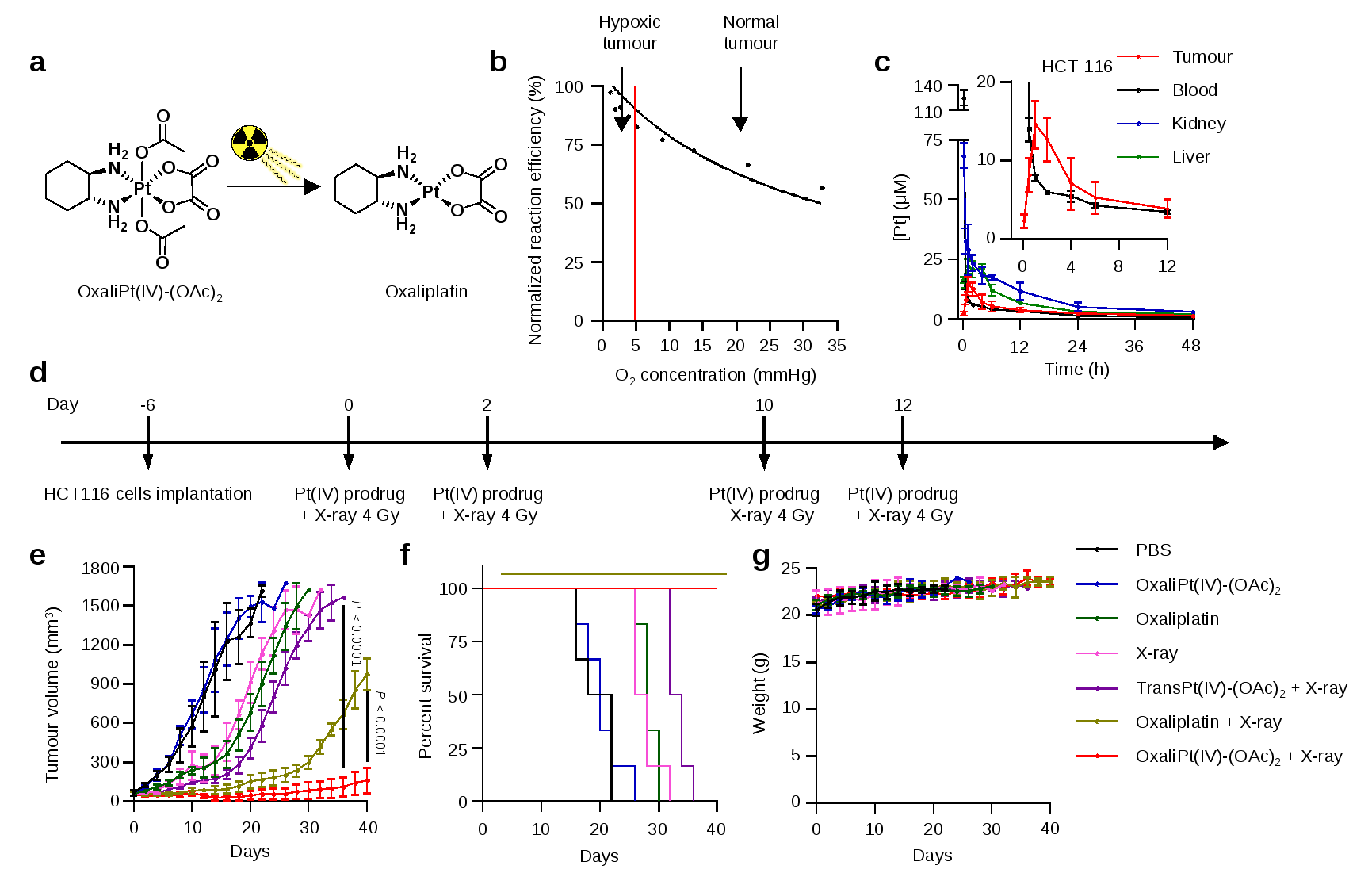 研究团队利用Pt(IV)前药被X射线激活释放Pt(II)抗癌药的化学性质,设计并研究出低毒性和良好药代动力学的前药oxaliPt(IV)-(OAc)2用于铂药适用的癌症治疗。OxaliPt(IV)-(OAc)2联合X射线治疗对肿瘤抑制效果,显著优于临床使用的Pt(II)药物联合X射线治疗,却没有增加副作用(图3)。