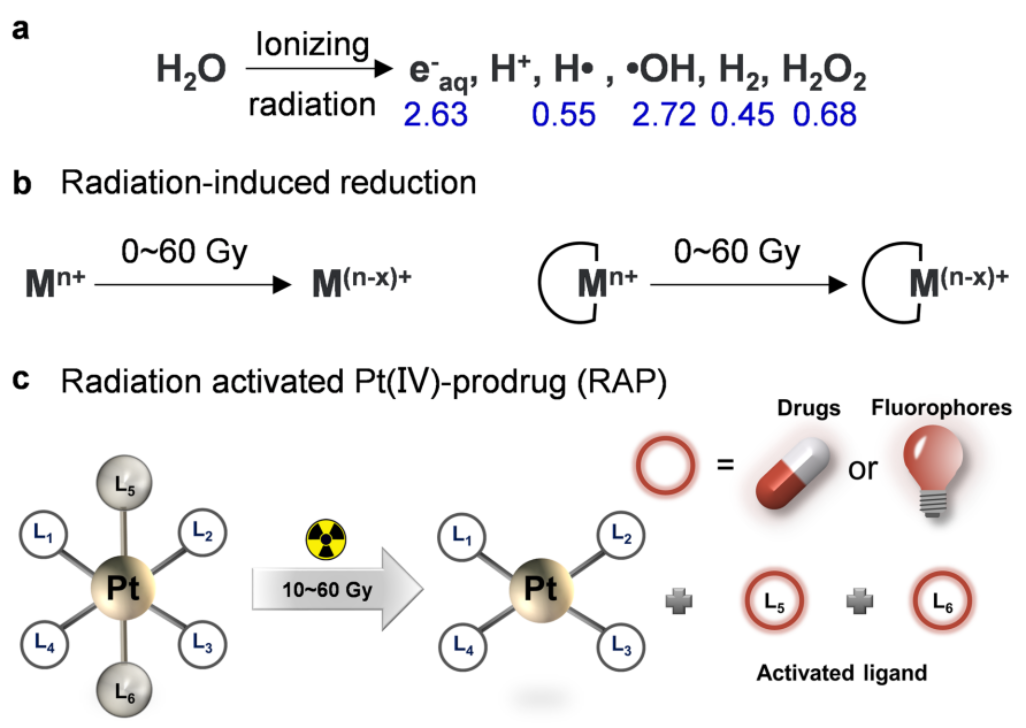 中国每年因癌症而死亡的人数高达250万,是70岁以下人群的首要死因。在癌症治疗时,患者通常需要接受放化疗联合治疗,其中放疗联合铂药更是一线治疗的常用手段。然而,铂药的系统毒性,与肿瘤辐射抵抗等因素已成为制约临床放化疗发展的关键问题。为解决这一临床中的实际问题,同时受到金属离子和配合物可以被高能射线下还原所启发,研究者提出并验证了Pt(IV)配合物经X射线还原可以释放出两个轴向配体,并形成Pt(II)配合物,且此反应迅速且高效(图2)。