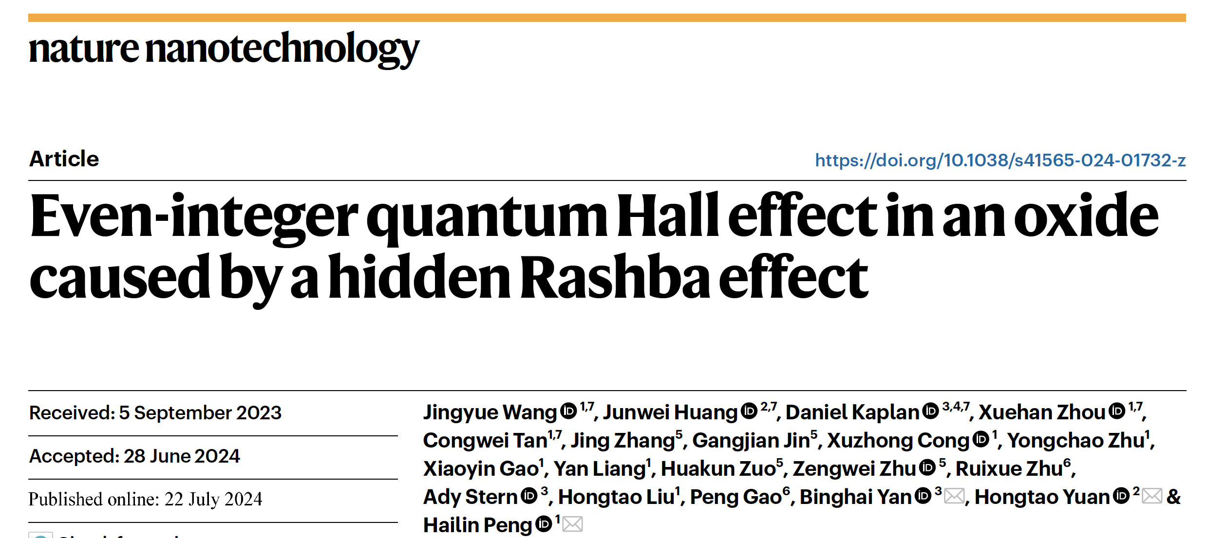 2024年7月22日,3003新葡官方网站彭海琳教授研究团队与南京大学袁洪涛教授团队、以色列威兹曼研究院颜丙海教授团队在《自然—纳米技术》( Nature Nanotechnology )在线发表了题为“Even-integer quantum Hall effect in an oxide caused by a hidden Rashba effect”的研究论文,报道了二维铋基半导体硒氧化铋(Bi2O2Se)中新奇的隐藏自旋极化,并首次发现了偶数量子霍尔效应。