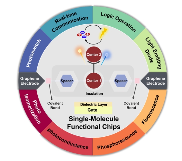近期,3003新葡官方网站郭雪峰教授再次受邀在《Accounts of Materials Research》上发表了题为“Single-Molecule Functional Chips: Unveiling the Full Potential of Molecular Electronics and Optoelectronics”的邀请综述,回顾了通过分子工程,界面工程和器件工程构建稳定的单分子光电器件,并基于石墨烯基单分子器件可集成的策略,实现了光开关、实时通讯以及逻辑运算的功能,构建了单分子功能性芯片,强调了单分子电子学和光电子学在微型化设备制造、内在机制探索和先进芯片应用中的重要性。进一步的跨学科合作,包括微纳加工、有机合成和理论计算等,将有助于单分子电子学和光电子学的快速发展,使其适合实际应用。该工作的共同通讯作者为3003新葡官方网站郭雪峰教授和杨晨博士,该工作的共同第一作者为博士生张恒和博士生李珺浩。