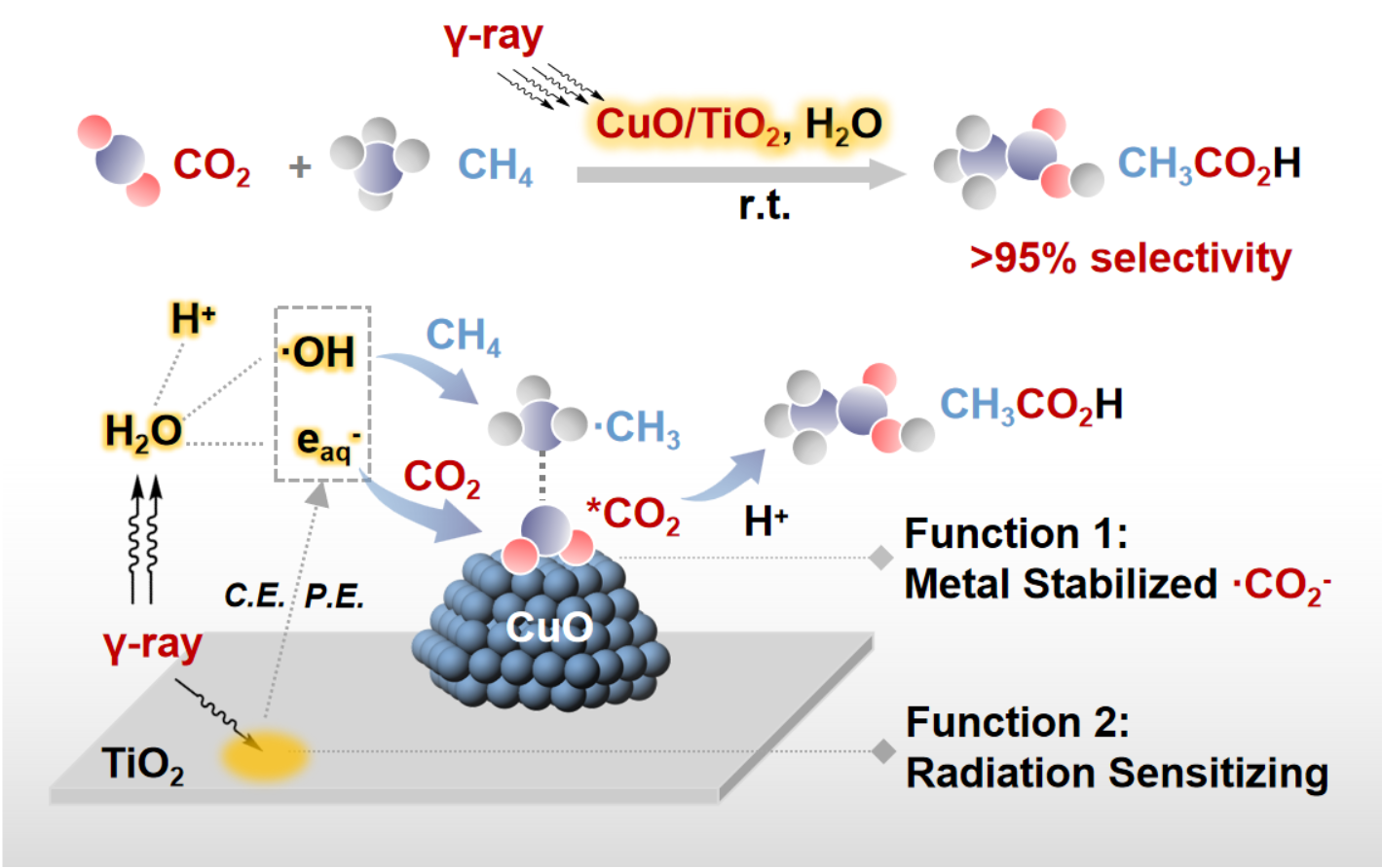 通过CH4和CO2的偶联反应合成CH3COOH,是一种高原子经济性的化学转化过程,有利于两种重要C1合成子的综合利用。然而,两者的高热力学稳定性导致该过程难以高效发生。电离辐射作为有待开发的赋能形式,可以在温和条件下辐解水,同时均匀产生氧化性羟基自由基·OH和还原性水合电子eaq-。