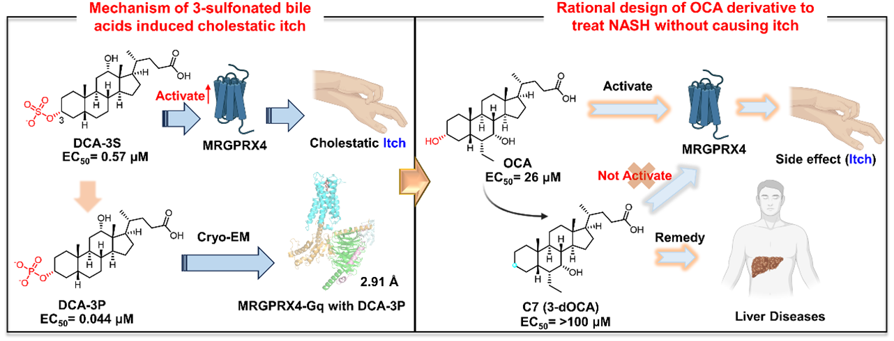该研究首先通过与临床医学紧密结合,针对胆汁淤积瘙痒患者血浆中的胆酸成分进行系统地代谢组学分析,发现了3位磺酸化修饰的胆酸分子在伴有严重瘙痒症状的患者体内的含量显著升高。这类磺酸化修饰的胆酸有望作为一种新的生物标志物,用于预测和监测瘙痒的发生。李毓龙课题组与雷晓光课题组合作,在之前的研究发现表达在人类背根神经节中的G蛋白偶联受体MRGPRX4(简称:hX4)会感应内源性胆酸分子,从而被激活、导致系统性瘙痒(Yu, et al. elife, 2019)。然而,具体哪种类型的胆酸分子可以更有效激活hX4,以及hX4是怎样被胆酸分子激活的等一系列科学问题还亟待阐明。