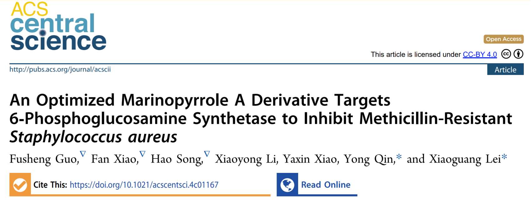 2024年10月25日,雷晓光课题组与秦勇课题组的合作研究工作以“An optimized marinopyrrole A derivative targets 6-phosphoglucosamine synthetase to inhibit Methicillin-resistant Staphylococcus aureus”为题发表在美国化学会旗舰期刊《ACS Central Science》上。该科学突破首次阐明了Marinopyrrole A 的衍生物MA-D1通过靶向6-磷酸葡萄糖胺合成酶(glucosamine 6-phosphate synthase, GlmS)抑制细菌细胞壁的合成来发挥杀伤MRSA的生物学功能。
