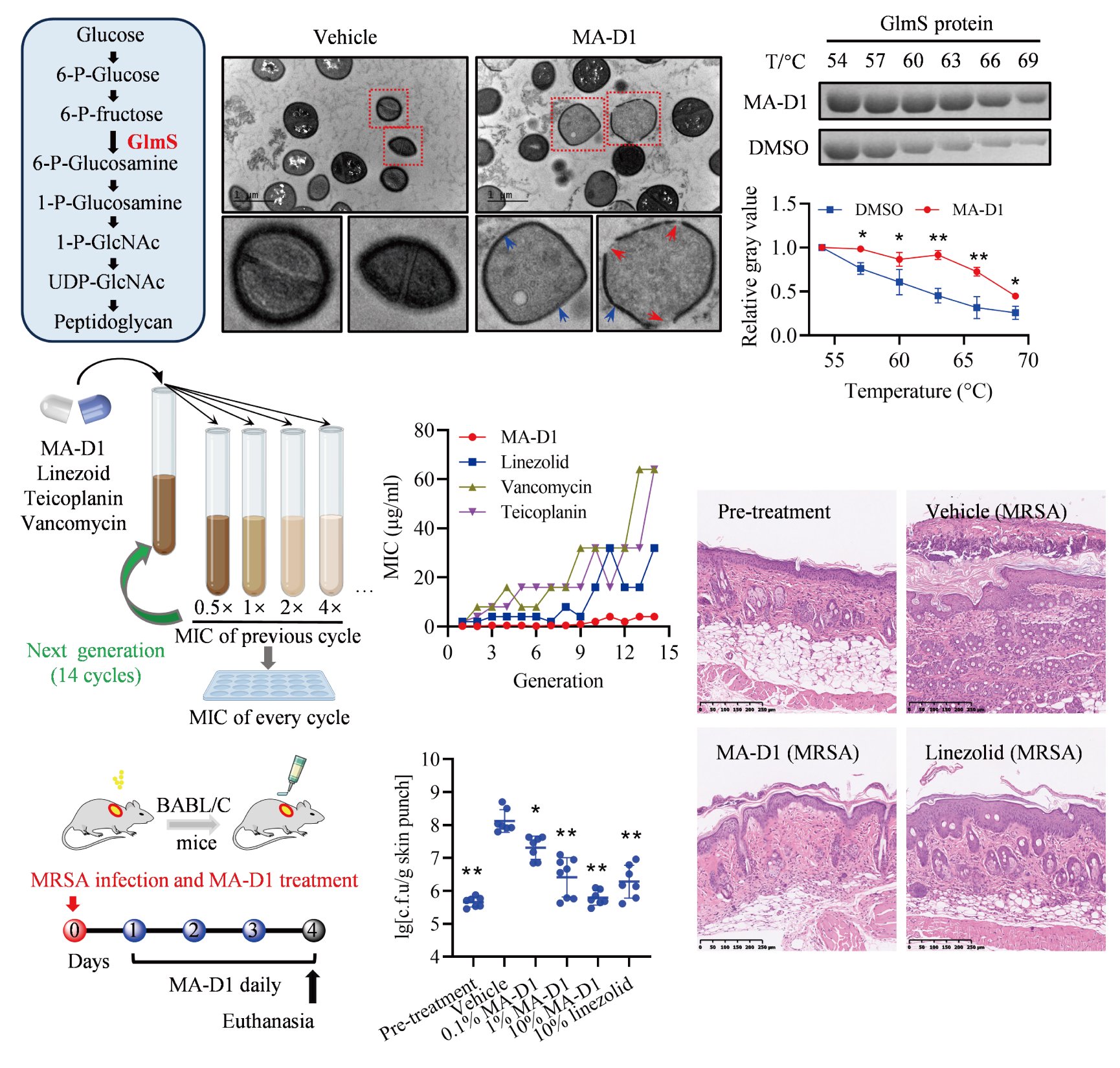 图2. MA-D1通过靶向GlmS在体内外具有良好的抗MRSA活性