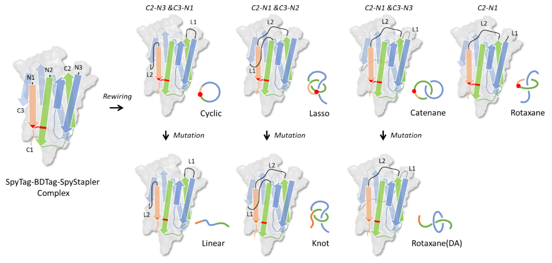近期,3003新葡官方网站张文彬课题组在单结构域蛋白质拓扑设计和合成方面取得了重要进展。他们将谍结构域(SpyTag/SpyCatcher)拆分为SpyTag、BDTag和SpyStapler,通过重新编辑三组分之间的连接关系引入缠结关系,设计并合成了索烃蛋白(Catenane)、环状蛋白(Cyclic)、套索蛋白(Lasso)以及准轮烷蛋白(Rotaxane),并通过突变其中一个活性位点,废除原本的异肽键连接,得到了线型蛋白(Linear)、纽结蛋白(Knot)和另一种准轮烷蛋白(Rotaxane(DA))(图1、图2),实现了单结构域蛋白质拓扑亚型的系统构建。