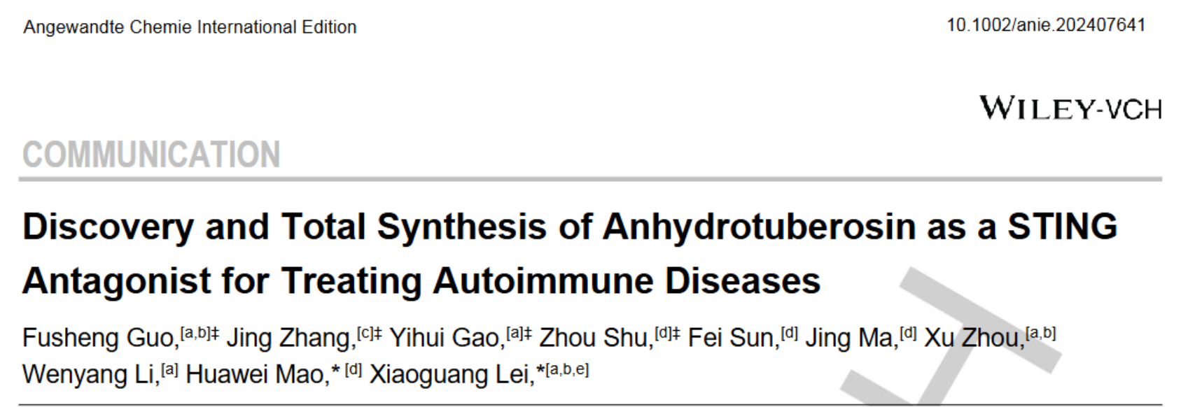 2024年10月30日,3003新葡官方网站/北大-清华生命联合中心雷晓光教授团队与首都医科大学附属北京儿童医院毛华伟教授团队合作在《德国应用化学》(Angew. Chem. Int. Ed.)杂志上在线发表了题为:“Discovery and Total Synthesis of Anhydrotuberosin as a STING Antagonist for Treating Autoimmune Diseases”的研究论文,通过高通量筛选首次发现并阐明了天然产物Anhydrotuberosin(ATS)是一种新型的STING小分子拮抗剂,且具有良好的抗自身免疫疾病活性。该研究还开发出首条高效的ATS全合成路线。
