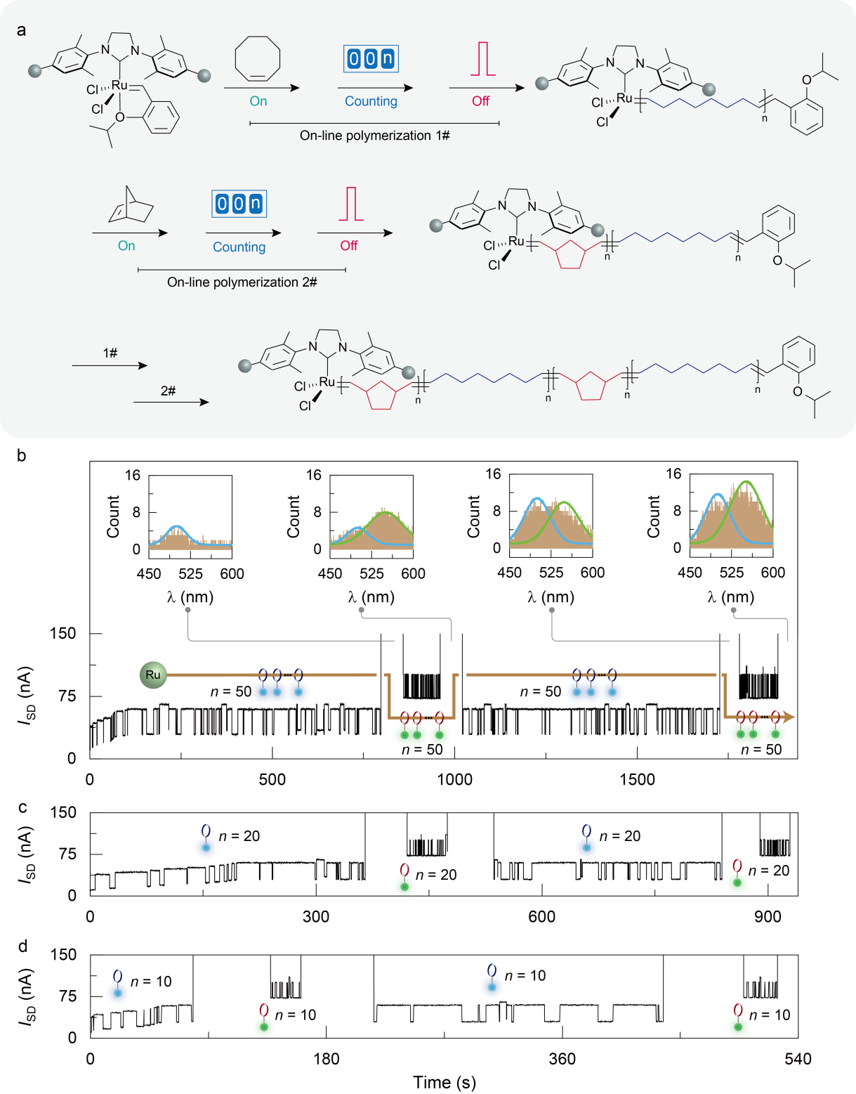 此外,研究人员利用具备单个单体插入事件分辨率的优势,实现了对单体插入动力学、分子内链转移、立构规整性、聚合度和嵌段共聚的在线操控,从而在器件上精确合成了单个聚合物(图3),展现了电场在调控分子反应机制方面的巨大潜力。