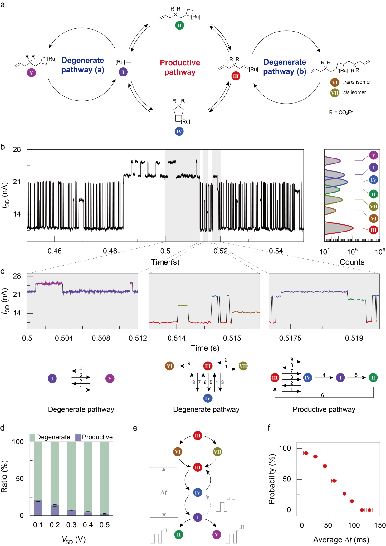 在此基础上,郭雪峰研究团队基于石墨烯电极的单分子电学检测系统,通过对关环复分解和开环易位聚合两种反应的深入探索,成功实现了以下进展,包括:对关环复分解中的生产型路径和隐藏的退化路径的实时可视化,且这两种路径均可通过外部电场进行调控(图2)。同时,他们发现了退化路径和生产型路径具有意想不到的促进型耦合效应,这表明,传统上被视为“不良”的反应路径在特定条件下能够增强目标产物的生成率,改变了人们对退化路径的传统认知。