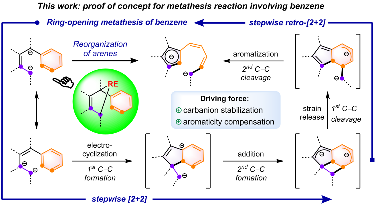 烯烃复分解反应在合成化学和材料科学中具有广泛的应用。尽管芳烃中存在潜在的烯烃单元,但芳环碳-碳键的复分解反应仍然是一个尚未探索的领域。这主要受到热力学限制以及缺乏合适反应途径的双重制约。一种潜在可行的策略是通过光激发将芳烃激发至三线态与烯烃发生反应。然而,该反应中通过[2+2]环加成生成的双环辛二烯中间体倾向于发生逆电环化生成环辛三烯,而非通过[2+2]开环得到复分解产物(图1a)。针对以上问题,他们提出了以双碳负离子替代烯烃参与芳香复分解反应的假设。该假设基于两个关键点:一是引入双碳负离子提高反应性,并通过碳负离子的稳定化提供额外驱动力;二是[2+2]环加成生成的中间体在负电荷的存在下,原有的6π逆电环化反应被抑制,从而为[2+2]开环提供机会(图1b)。