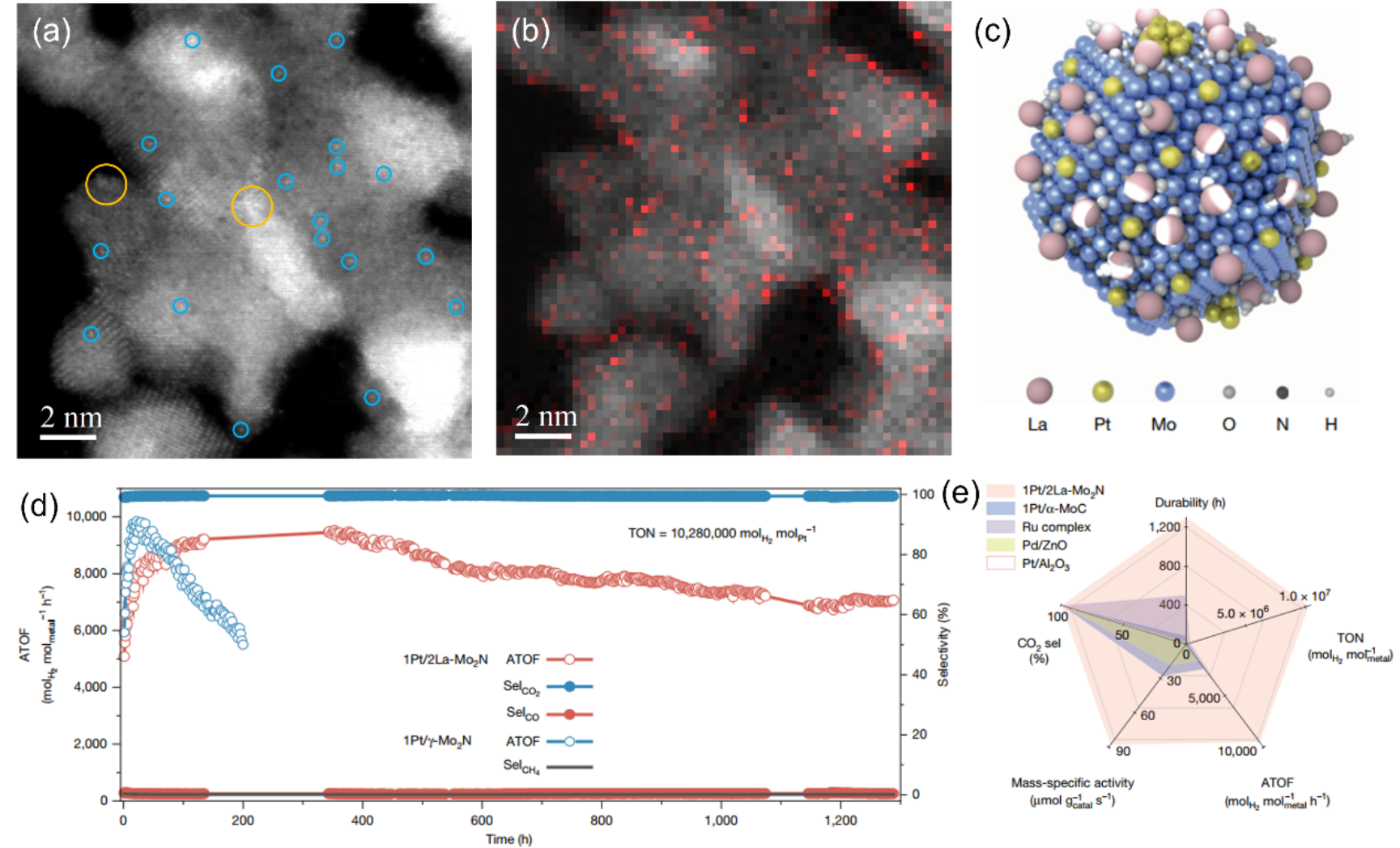 图1. Pt/La-Mo₂N催化剂的结构及产氢催化性能。
