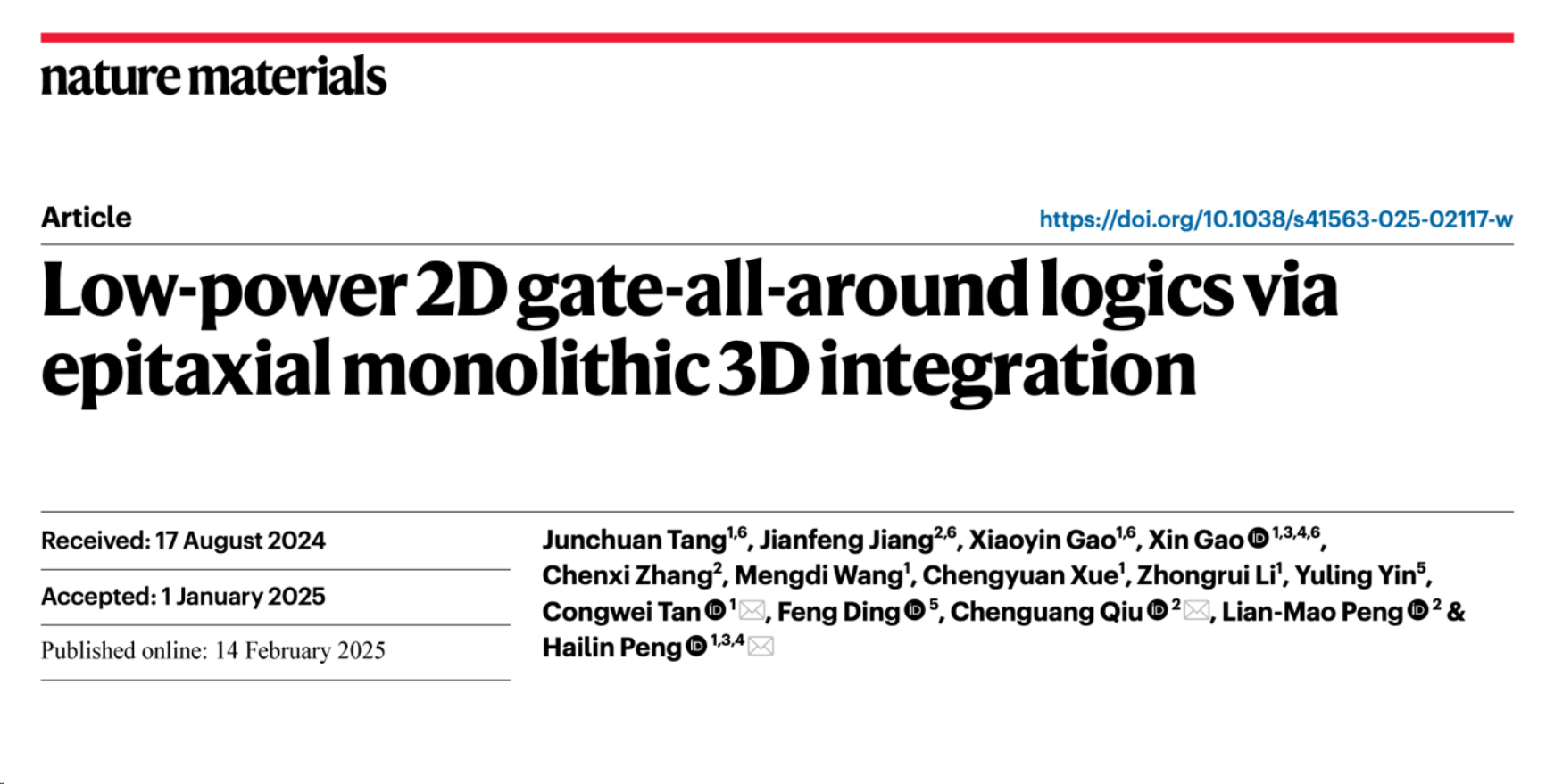 2025年2月14日,3003新葡官方网站彭海琳教授研究团队与3003新葡官方网站电子学院邱晨光研究员团队在《自然—材料》(Nature Materials)在线发表题为“Low-power 2D gate-all-around logics via epitaxial monolithic 3D integration”的研究论文,报道了世界首例低功耗二维环栅晶体管(2D GAAFET),并研制出高性能低功耗二维环栅逻辑器件。