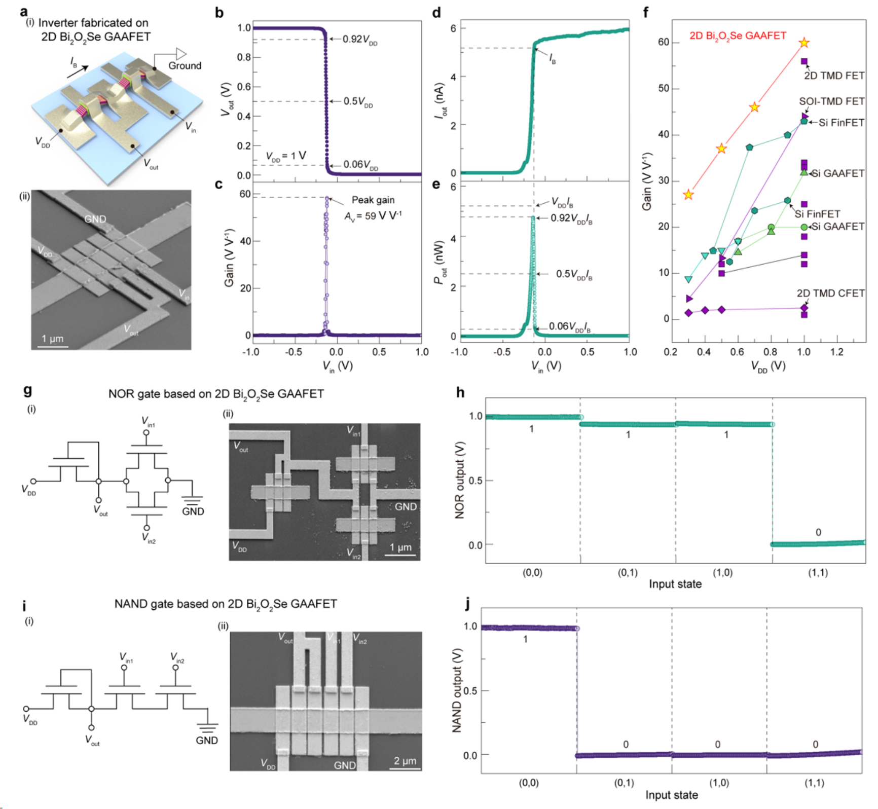 图5. 二维铋基环栅逻辑单元。二维铋基环栅非门示意图(a),工作曲线(b, c)、功耗(d, e)及增益对比(f); 二维铋基环栅或非门(g, h),与非门(i, j)的结构表征与功能。