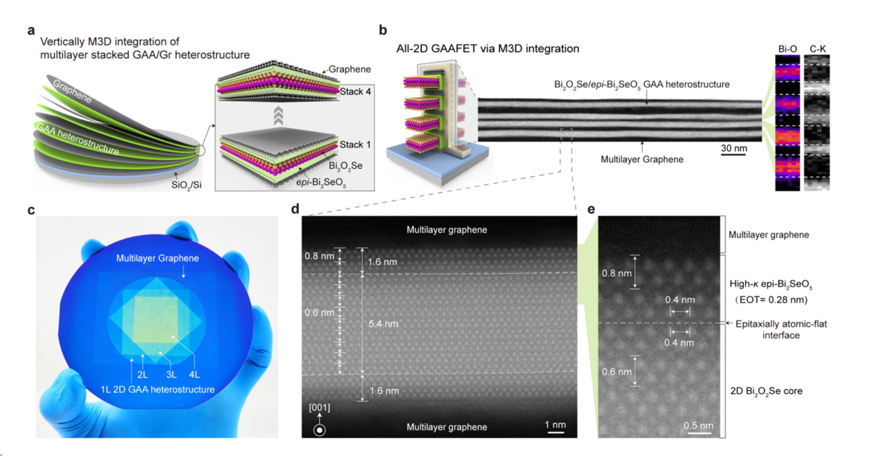 图2. 二维Bi2O2Se/Bi2SeO5环栅外延异质结与三维异质集成。(a-c)晶圆级多叠层二维铋基环栅异质结的示意图(a)、截面透射表征与元素分析(b)和光学照片(c);二维铋基环栅晶体管的原子级平整界面(d, e)。