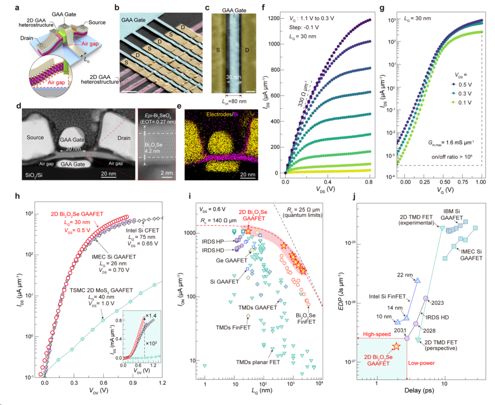 图4. 二维铋基环栅晶体管的电学性质。二维铋基环栅异晶体管的示意图(a),扫描电镜图(b,c),截面透射电镜图(d)和元素分析(e);晶体管的输出(f)和转移(g)特性及性能(h, i)与能效(j)的客观对标。