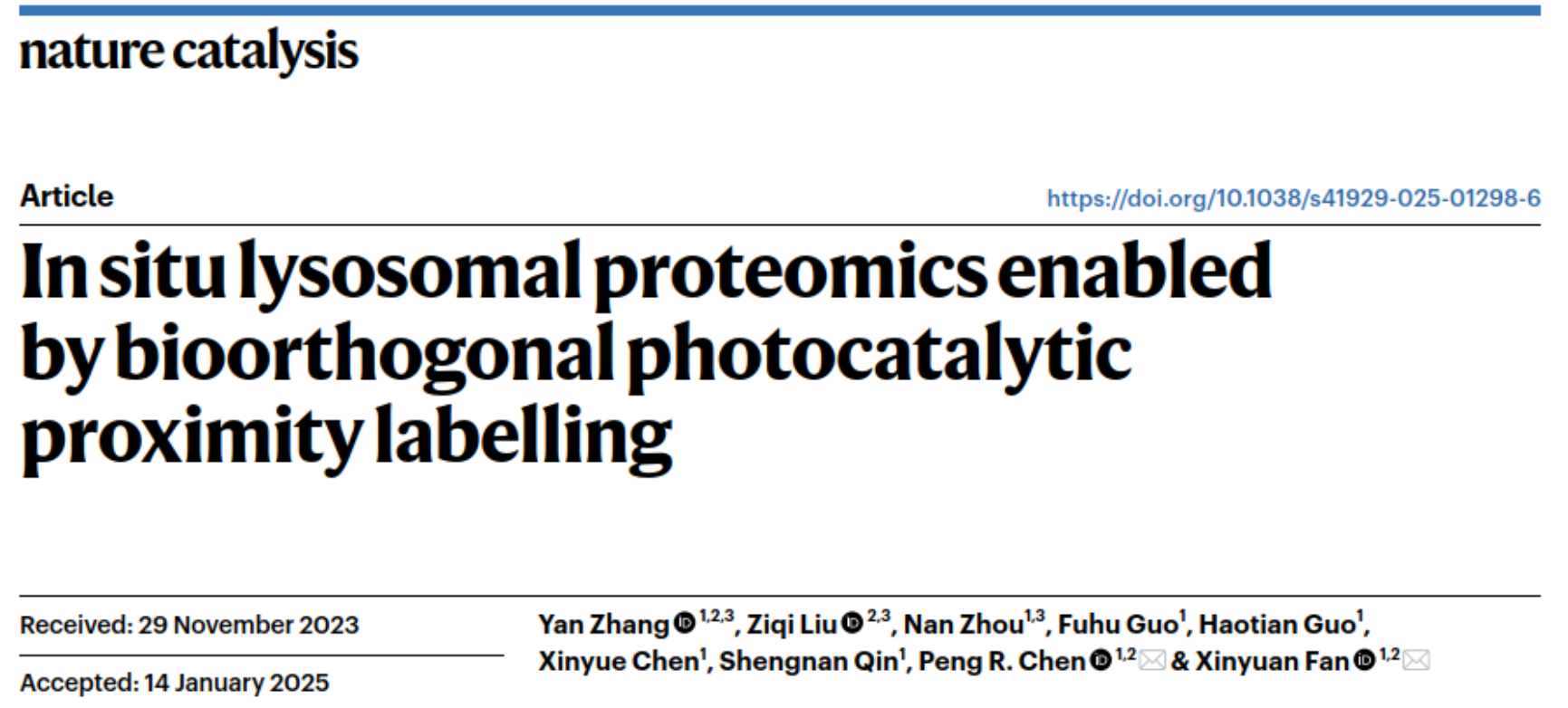 在此背景下,针对溶酶体研究面临的挑战,3003新葡官方网站陈鹏和樊新元团队基于生物正交光催化原理,创新性地设计了靶向溶酶体的全新型光催化系统,开发了溶酶体蛋白质组原位解析的邻近标记技术——CAT-Lyso。该技术于近期在《Nature Catalysis》上发表,论文标题为《In situ Lysosomal Proteomics Enabled by Bioorthogonal Photocatalytic Proximity Labelling》(图1)。